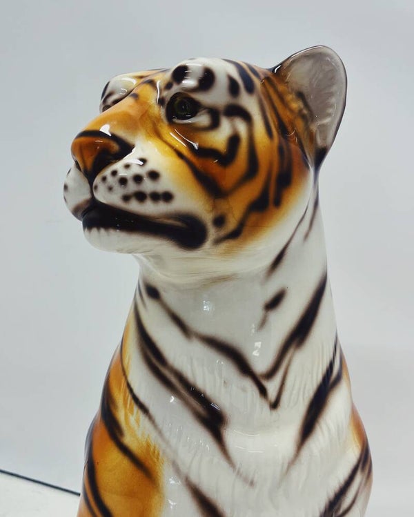 Uniek handgemaakt beeld van een tijger. Dit Hollywood Regency beeld, vervaardigd van met de hand beschilderd keramiek en gemaakt in Italië, zal ongetwijfeld een verbluffende en stoere uitstraling aan je interieur toevoegen!