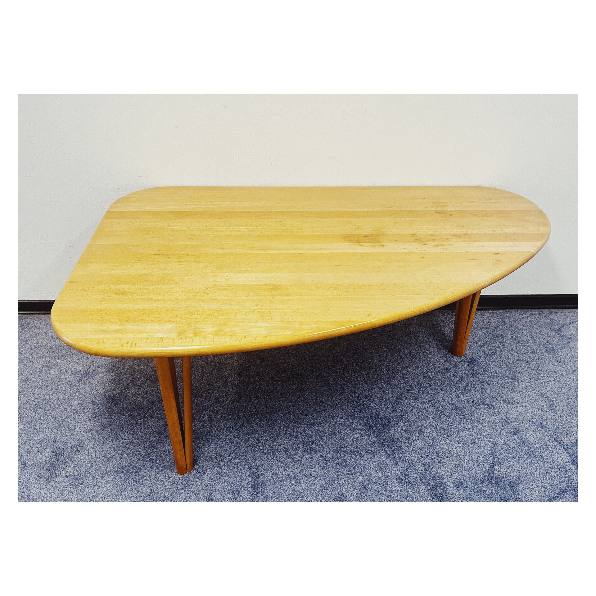 Vintage niervormige salontafel van beukenhout. De tafel staat op bijzondere opengewerkte houten poten en heeft een beuken volhouten blad. De tafel heeft was slijtage vlekken op het bovenblad maar is verder, gezien de leeftijd nog in goede vintage conditie.
