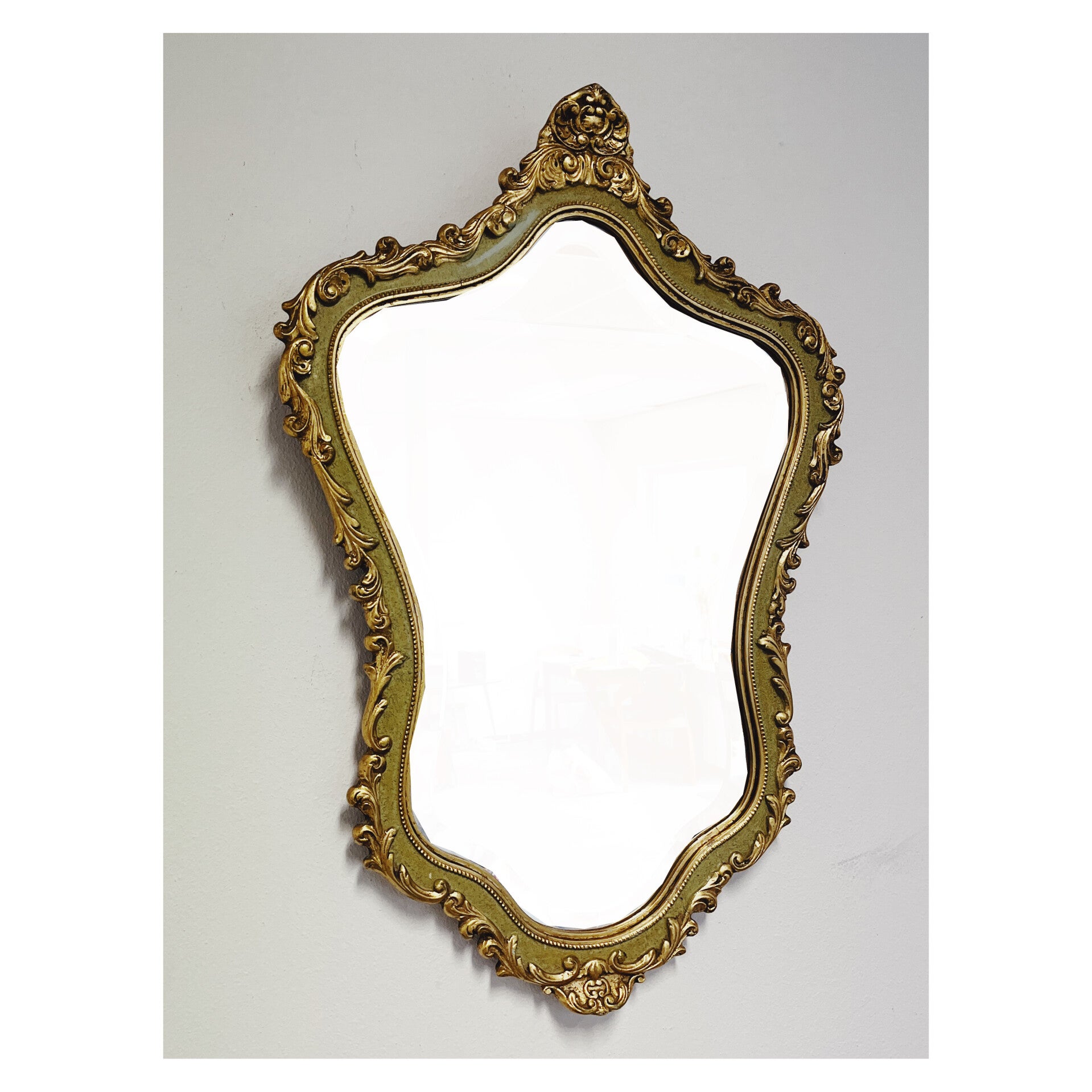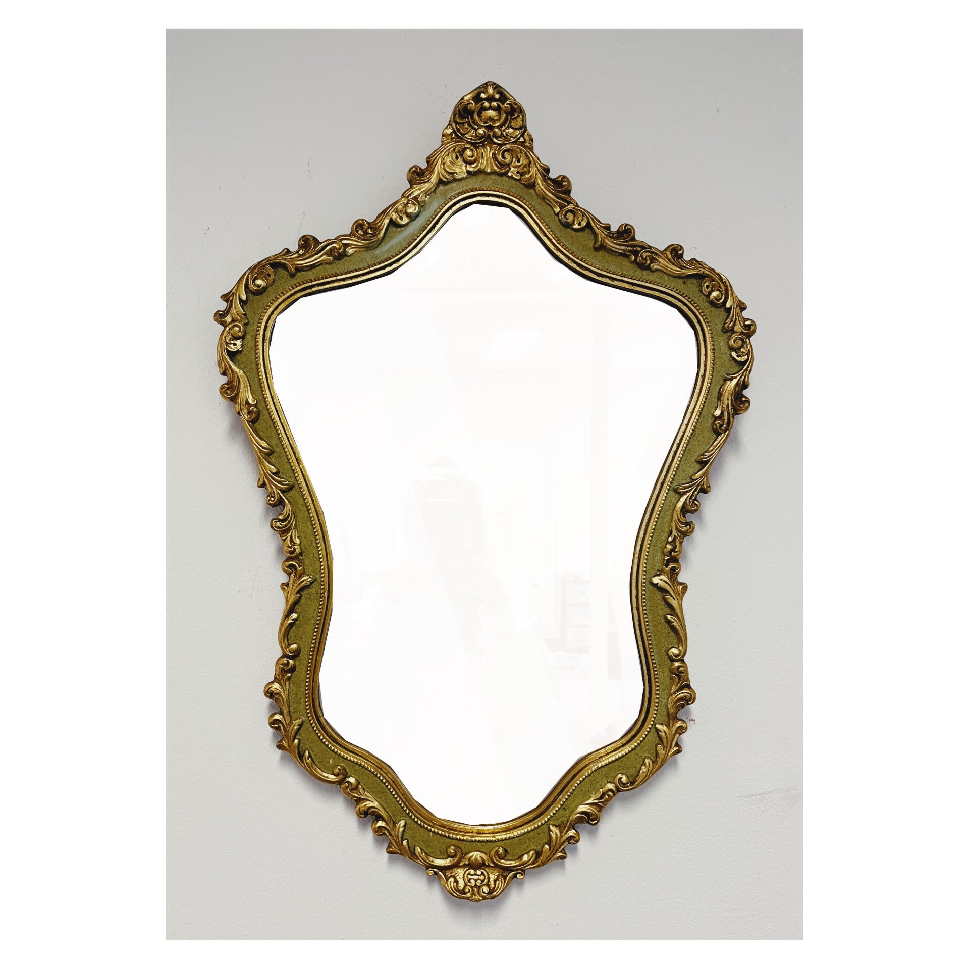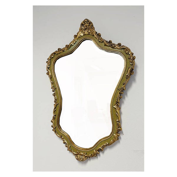 Klassieke barok spiegel met decoratief goud / groenen frame. De spiegel heeft een prachtige houten lijst met een sierlijke kuif. Deze gouden klassieker is in hele goede conditie en heeft een stevig ophangsysteem.