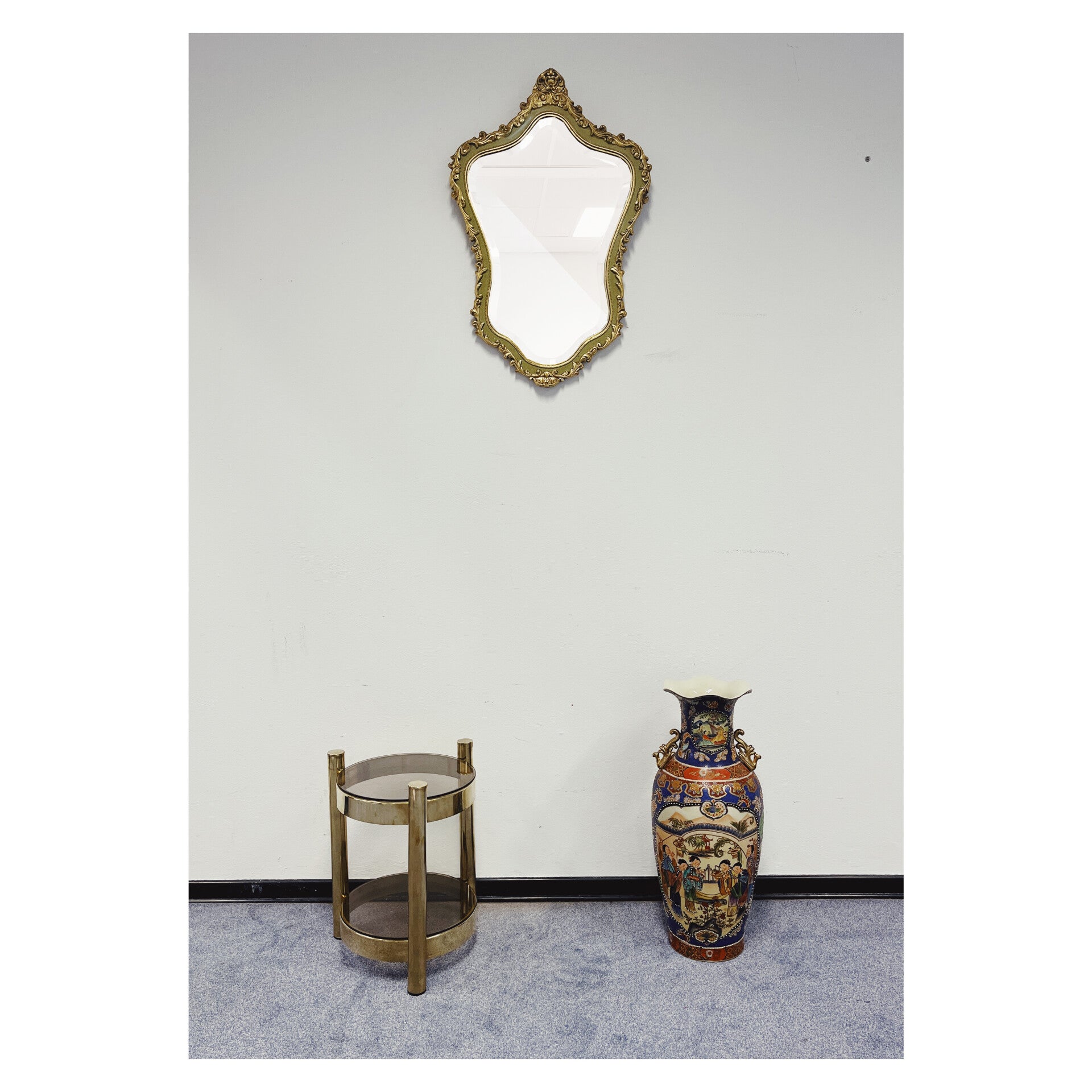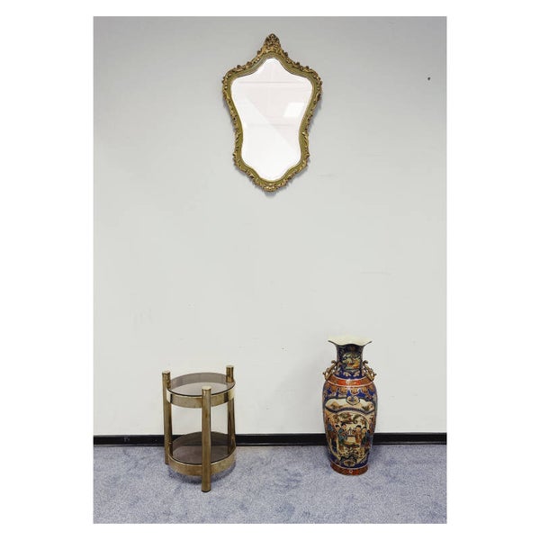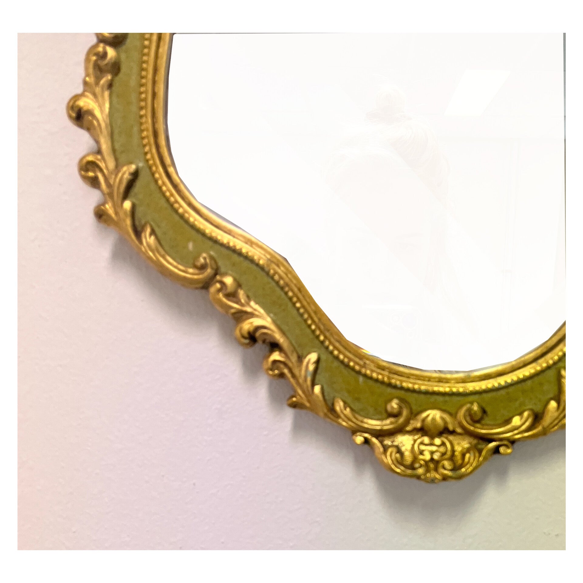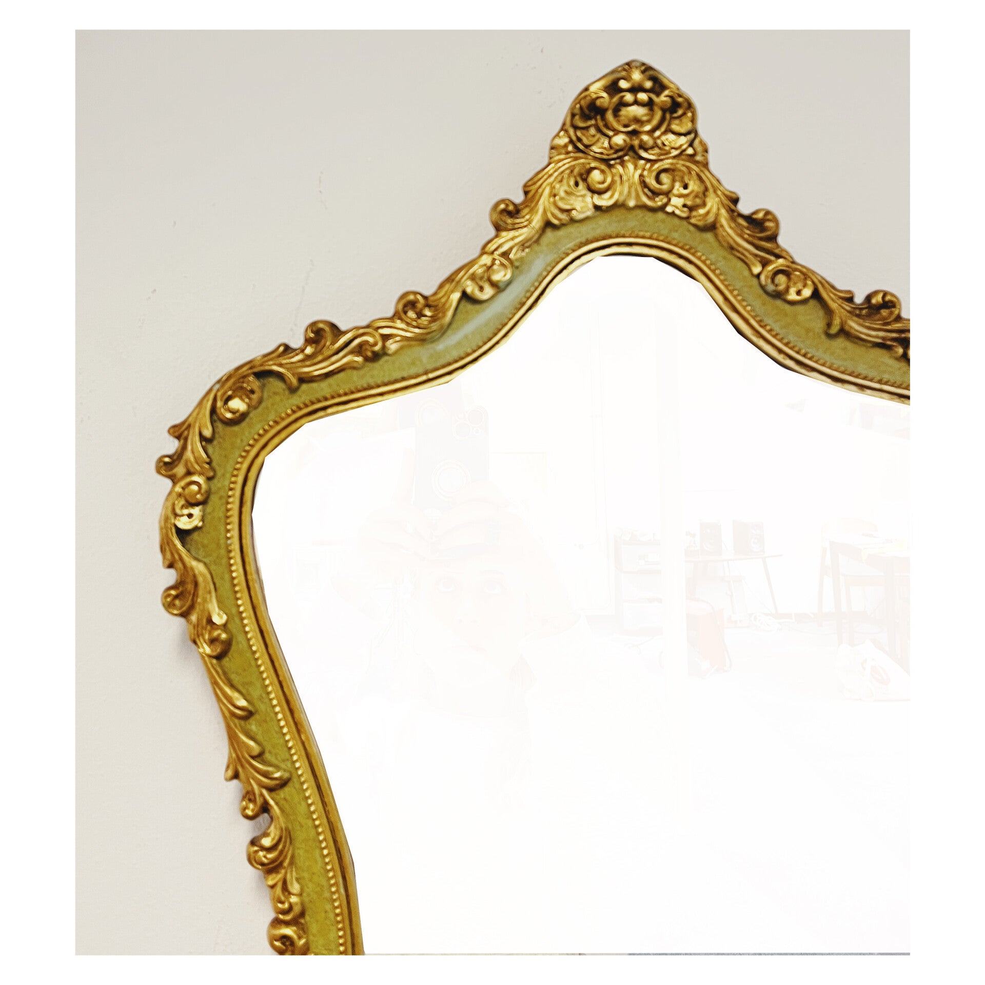 Klassieke barok spiegel met decoratief goud / groenen frame. De spiegel heeft een prachtige houten lijst met een sierlijke kuif. Deze gouden klassieker is in hele goede conditie en heeft een stevig ophangsysteem.