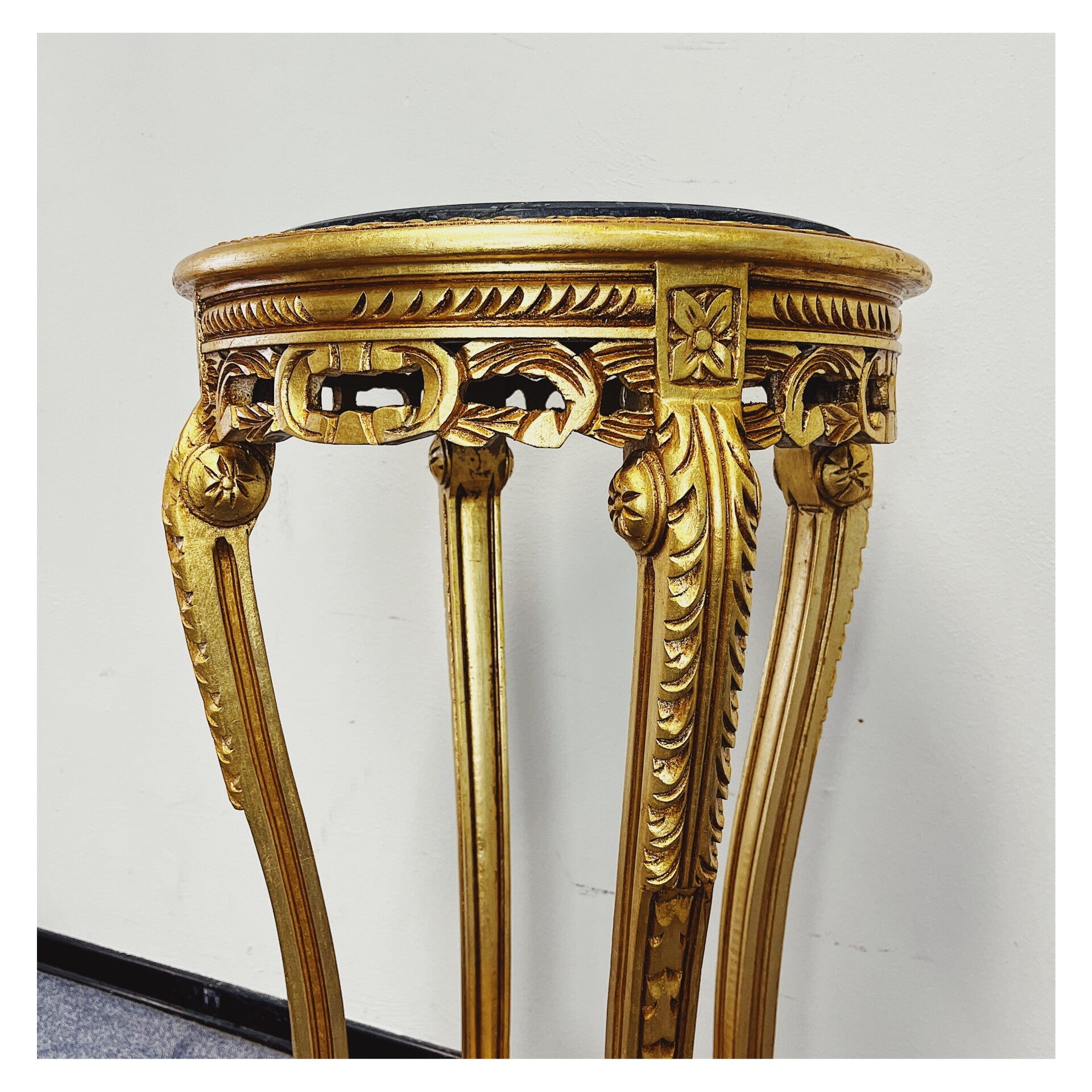 Louis XV Pedestal van verguld hout. De pedestal heeft een beige marmeren bovenblad die los op het onderstel ligt. De tafel is perfect voor het tentoonstellen van je mooiste vazen of planten. Het wit/beige natuursteen heeft een klein chipje eraf, maar dat is niet heel duidelijk te zien, verder is het meubel in goede vintage conditie!