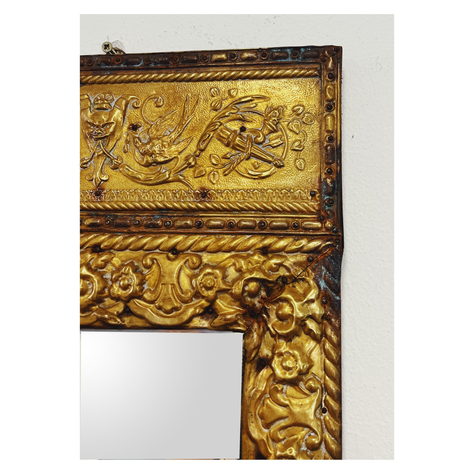 Koper gehamerd spiegeltje met sierlijke omlijsting. Het spiegeltje heeft wat zichtbare gebruikssporen en vlekken in het glas maar dat maakt het item gezien de leeftijd ook wel uniek. De spiegel heeft een stevig ophangsysteem.