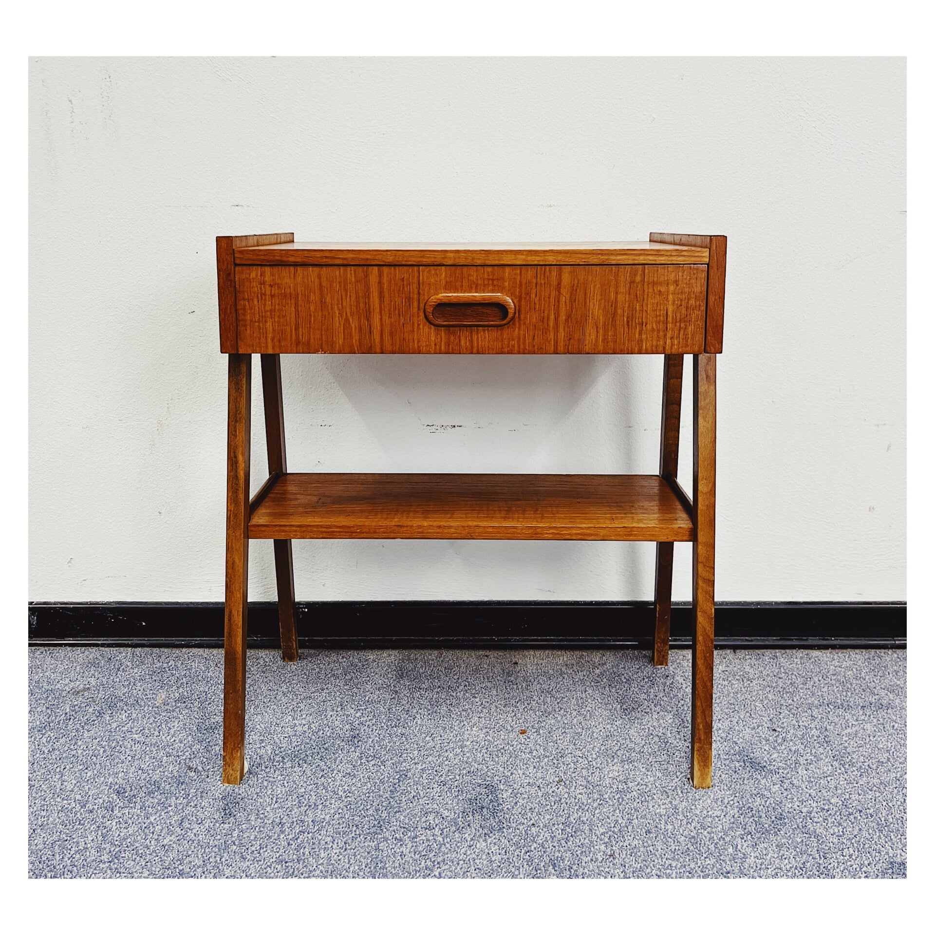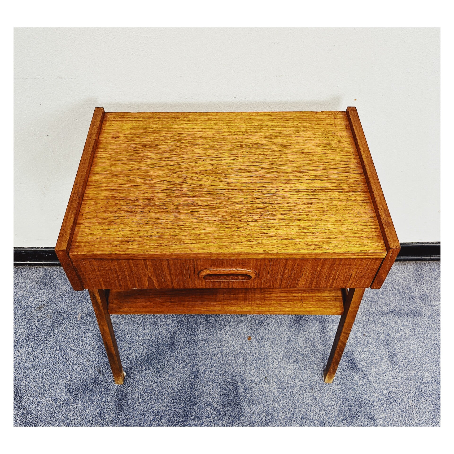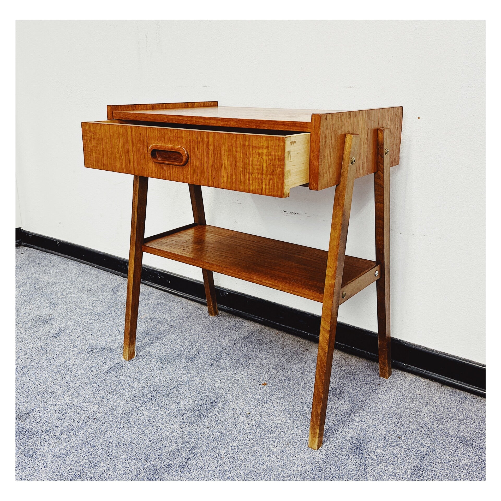Vintage nachtkastje afkomstig uit Zweden. Het kastje beschikt over één lade en heeft aan de onderkant een plank voor het opleggen van spullen. Het bovenblad heeft wat verkleuringen naar leeftijd, maar het kastje kan zeker nog een ronde mee!
