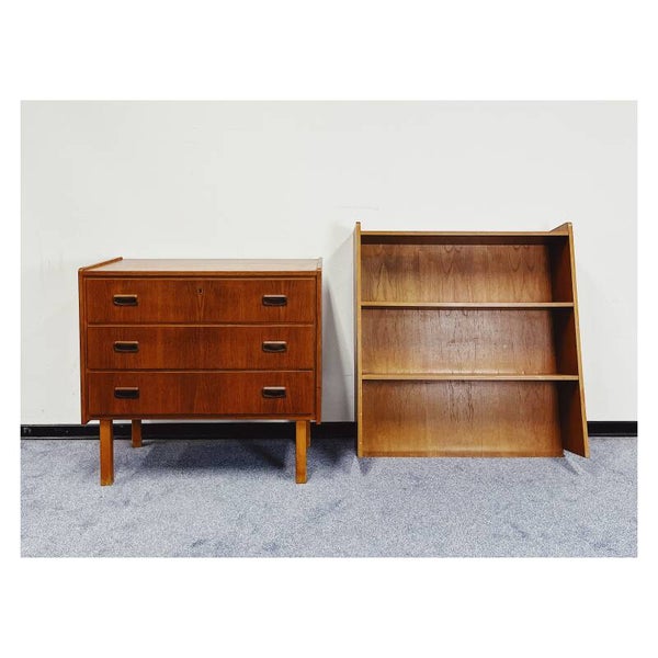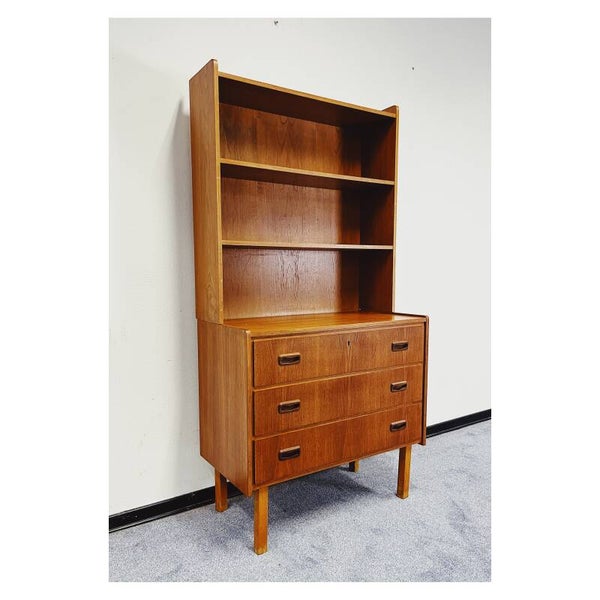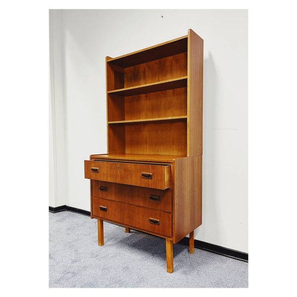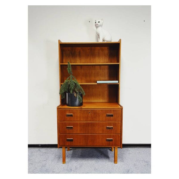De bovenkant van de kast heeft verschillende vakken voor het opbergen van boeken of andere items. Het bovenstuk hoort los te staan op het onderstel maar staat stevig. De kast dient daarom wel tegen een wand geplaatst te worden. De kast is in een goede vintage staat!