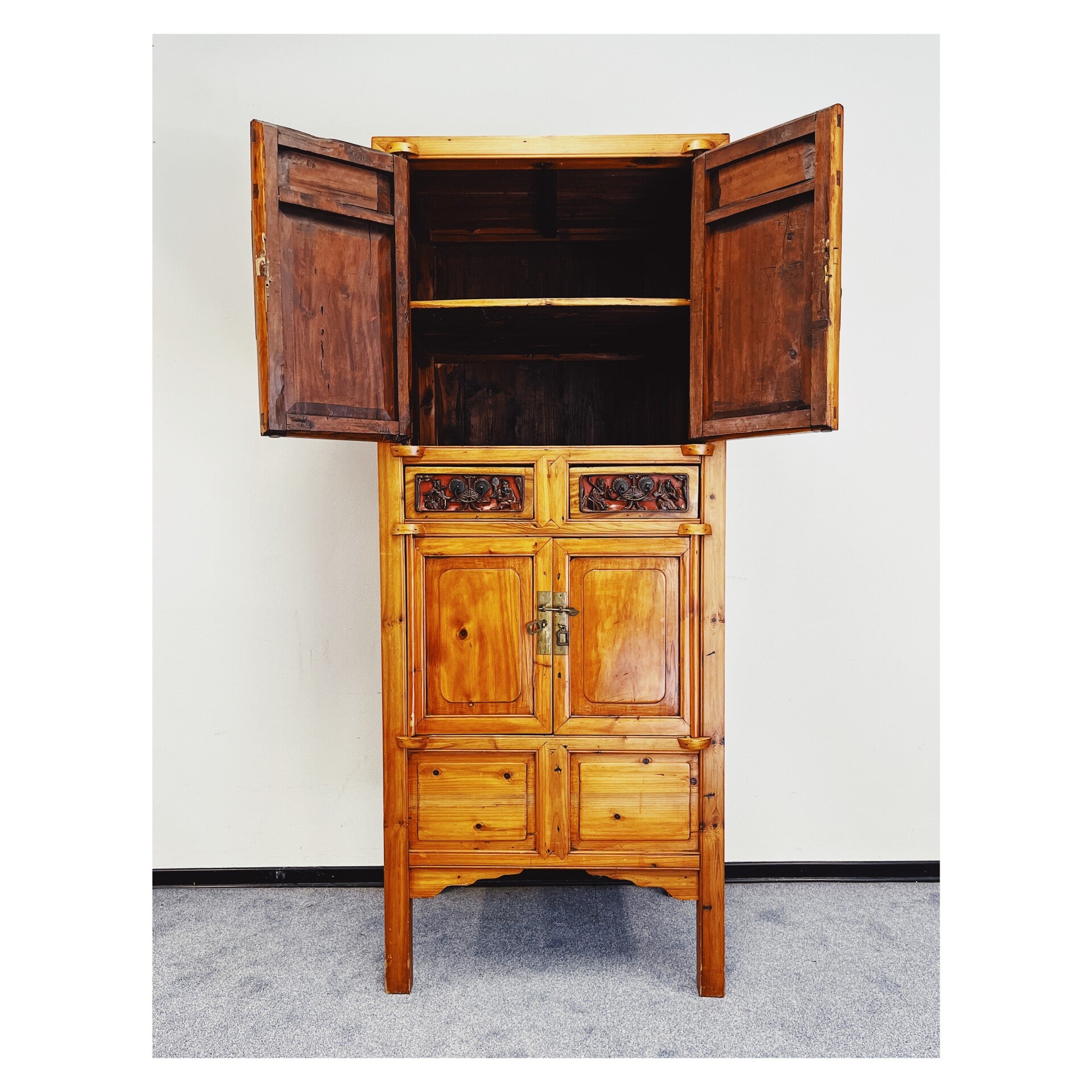 Waanzinnig mooie Chinese kast. De antieke kast heeft vier deuren en twee laden. Aan de binnenkant van beide deuren bevind zich een plank voor het scheiden van spullen. De kast beschikt over prachtig steekwerk in zowel de laden als deurfronten.
