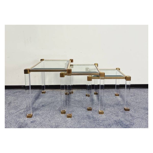 Mooie set nesting tables met facet geslepen glas. De set heeft een frame van messing en staat op poten gemaakt van plexiglas. Het messing en plexiglas hebben hier en daar wat gebruikssporen, passend bij de leeftijd. De tafeltjes worden als set verkocht!