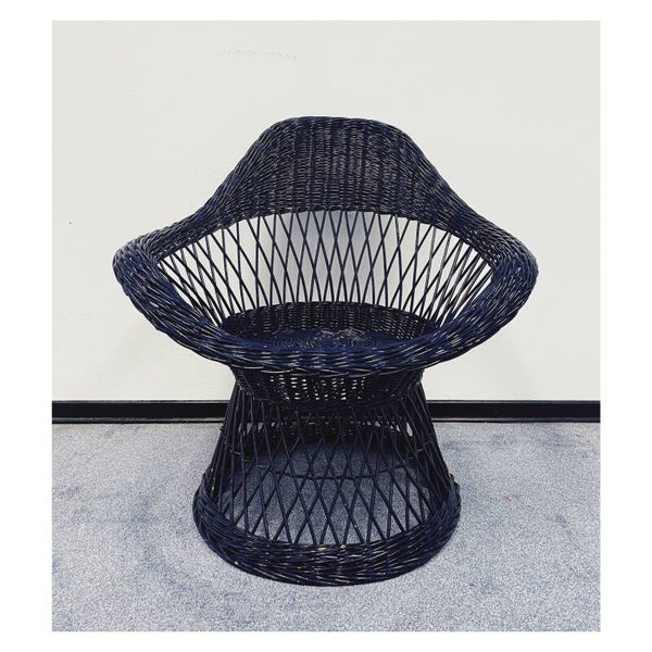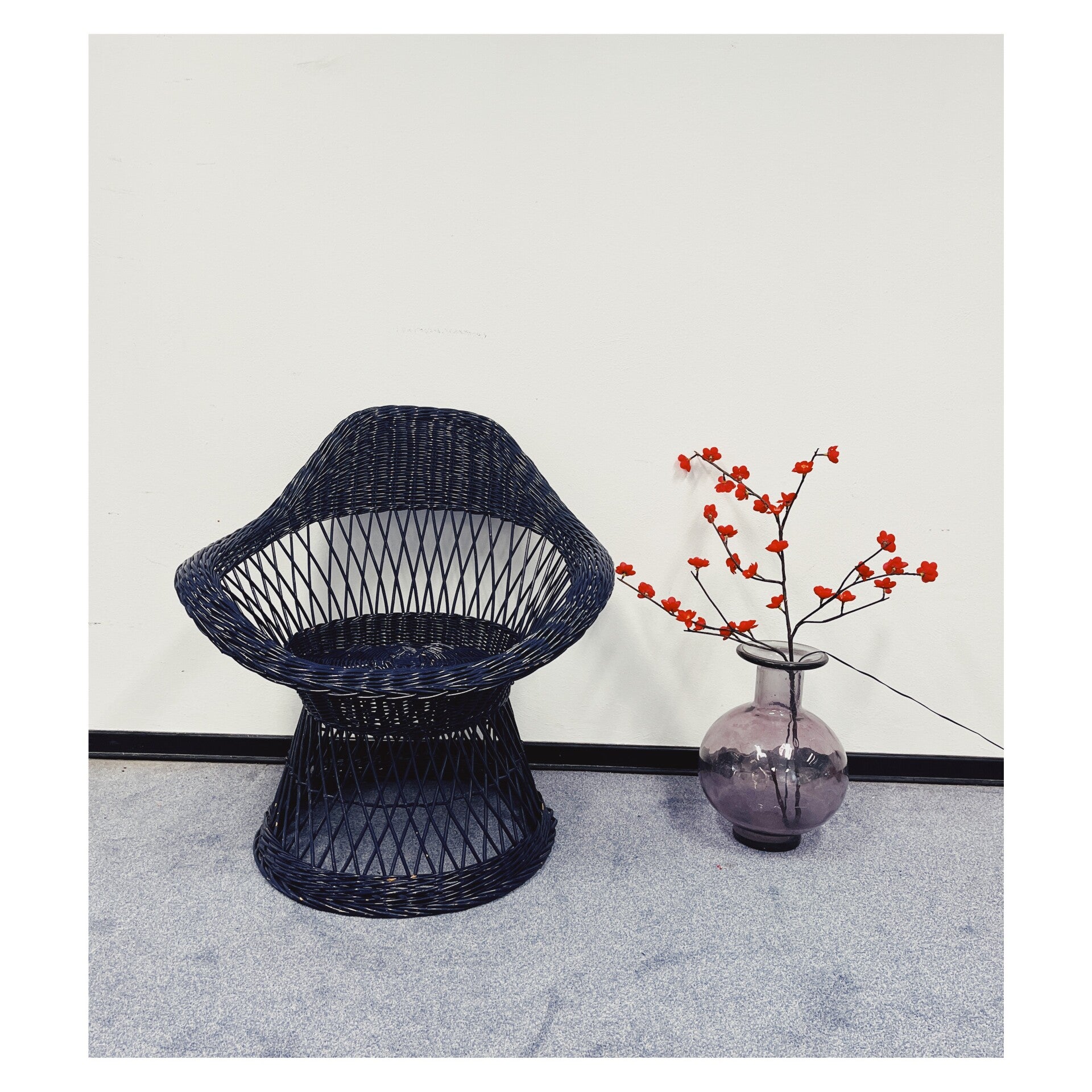 Vintage Rotan kuipstoel in een donkerblauwe kleur. De stoel zit heerlijk en geeft een gezellige sfeer. Zowel voor buiten als binnen.Afmetingen Hoogte: 72cmZithoogte: 39cmBreedte: 70cmDiepte: 45