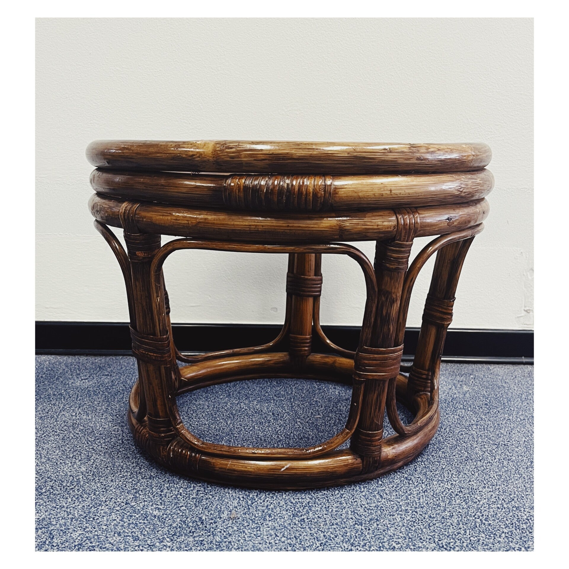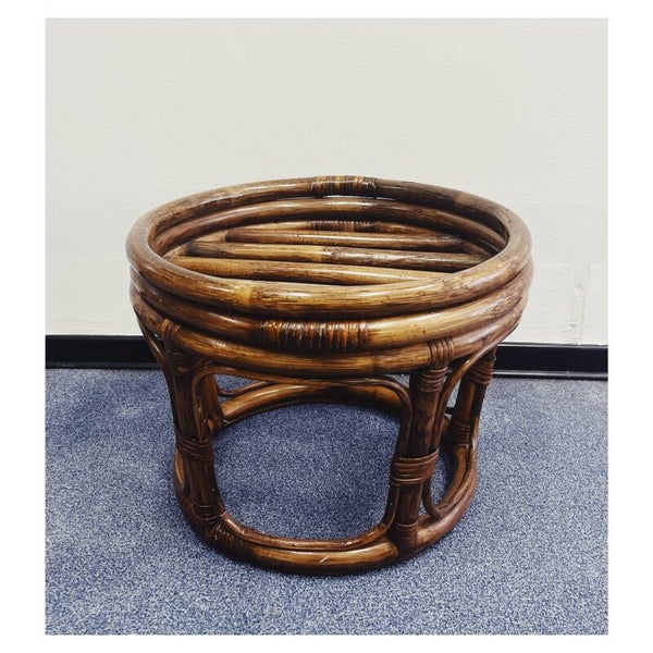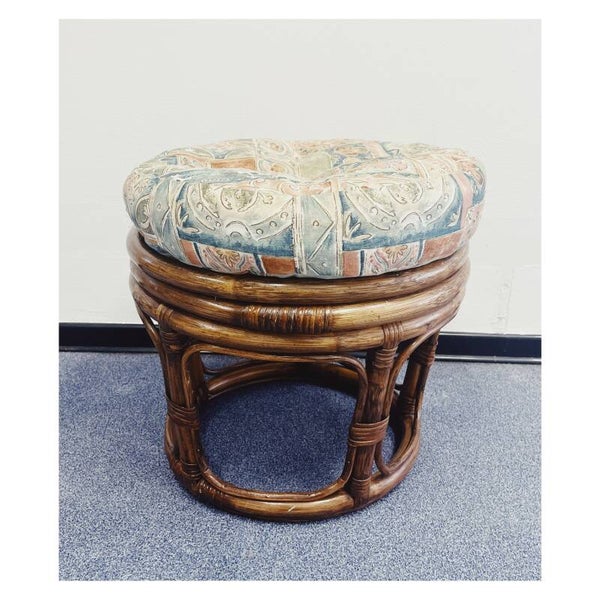 Vintage Rotan krukje. Het stoeltje wordt gevormd door een rotan frame met daarin een retro stoffen kussen.AfmetingenHoogte: 34cmDiameter: 44cm