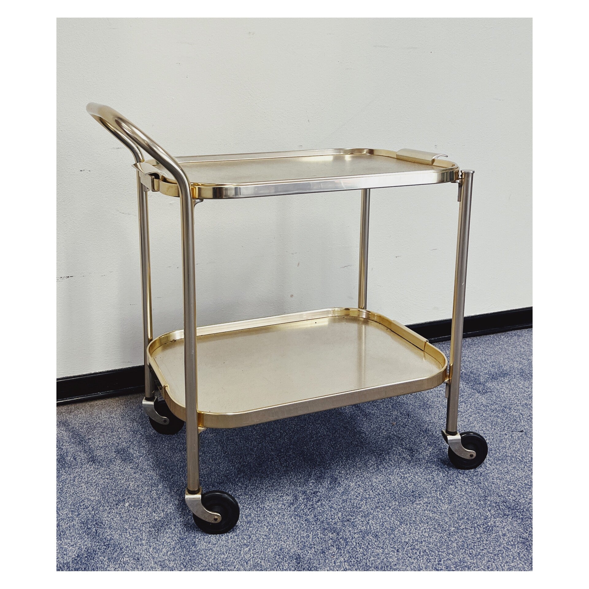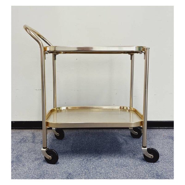 Kaymet trolley van goud aluminium. Deze Engelse design klassieker heeft een handig compact formaat. Het bovenblad kan als een echte thee trolley als dienblad gebruikt worden. De Kaymet trolleys uit Londen staat bekend om hun unieke designs die al sinds 1947 wereldwijd verkocht worden. De bar cart heeft minimale gebruikssporen en de wielen rijden nog helemaal soepel.