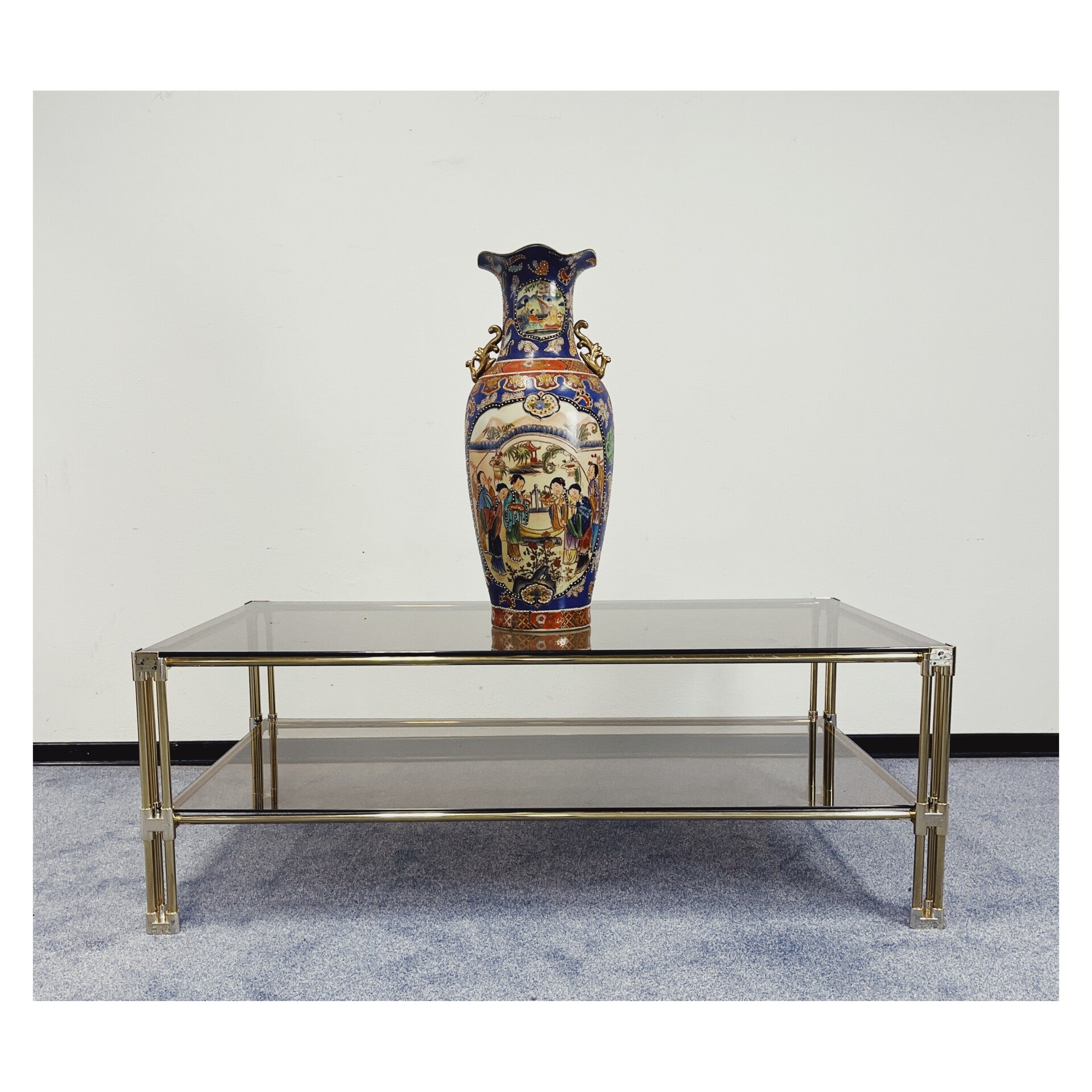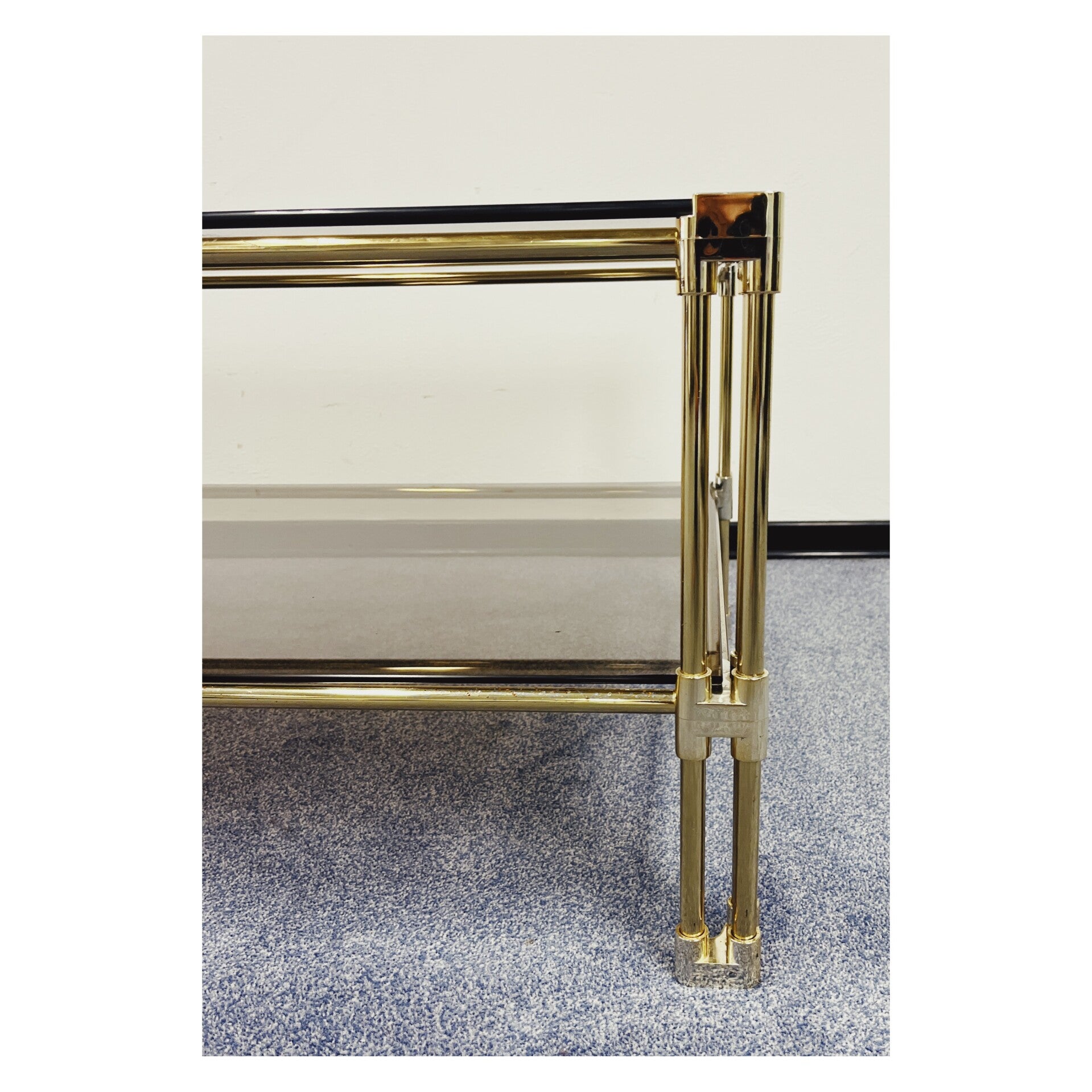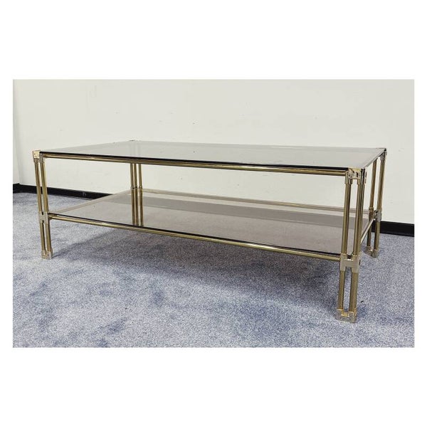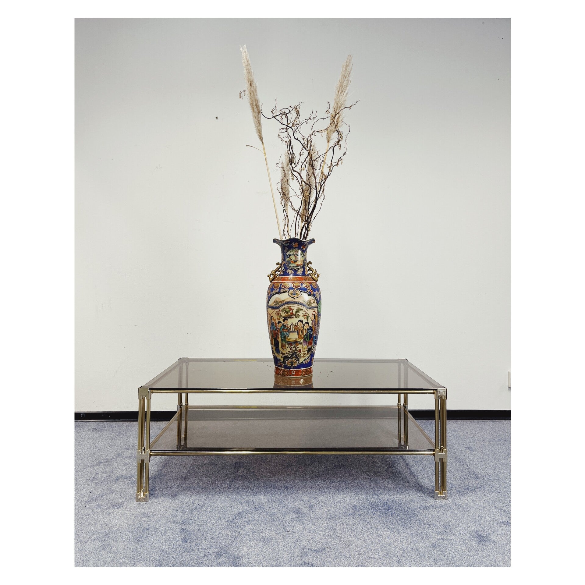 Rechthoekige salontafel van rookglas en goud messing onderstel. De tafel heeft twee lagen van rookglas. De poten en het gehele frame zijn van messing met een goud laagje. Het frame en glas hebben hier en daar wat lichte krassen naar leeftijd.