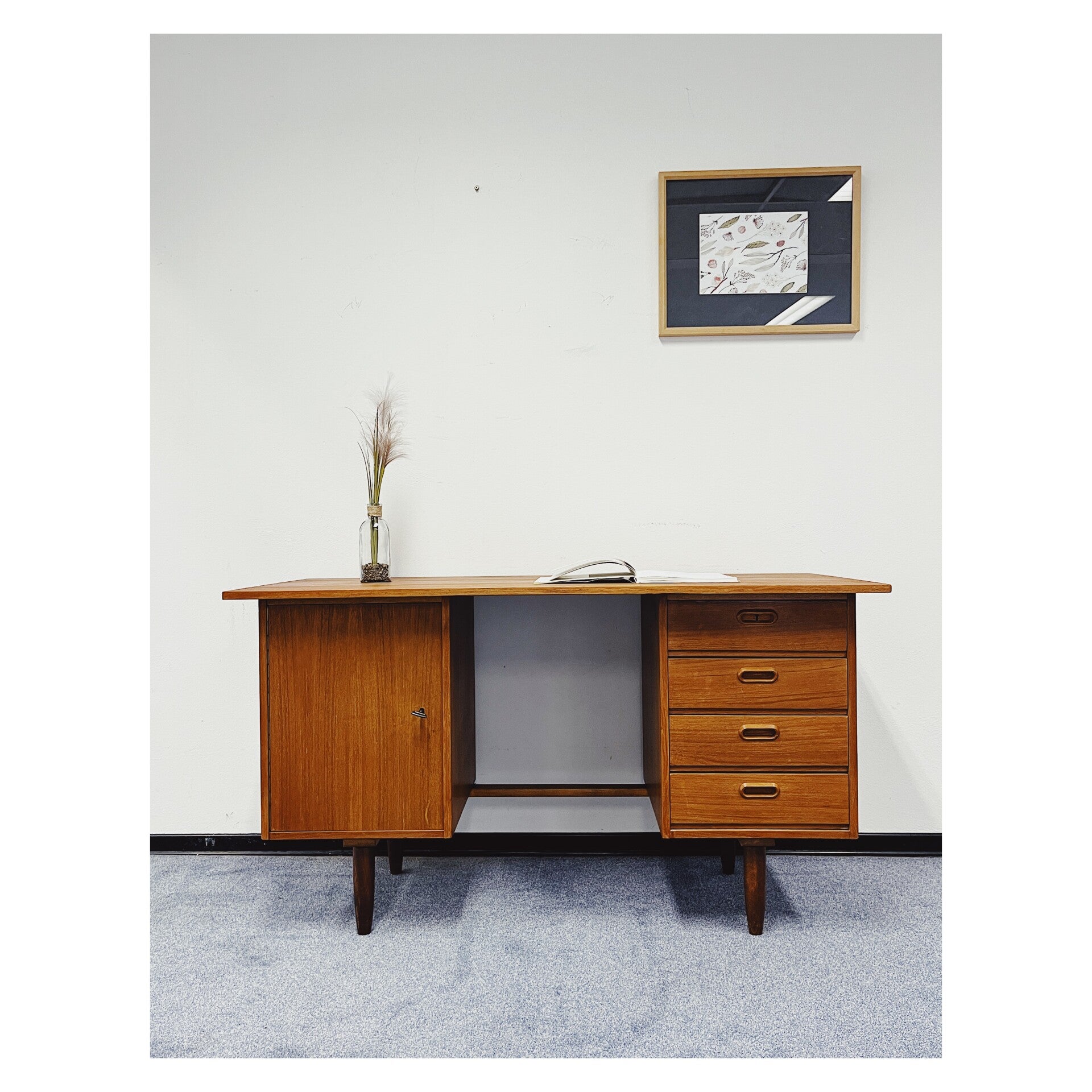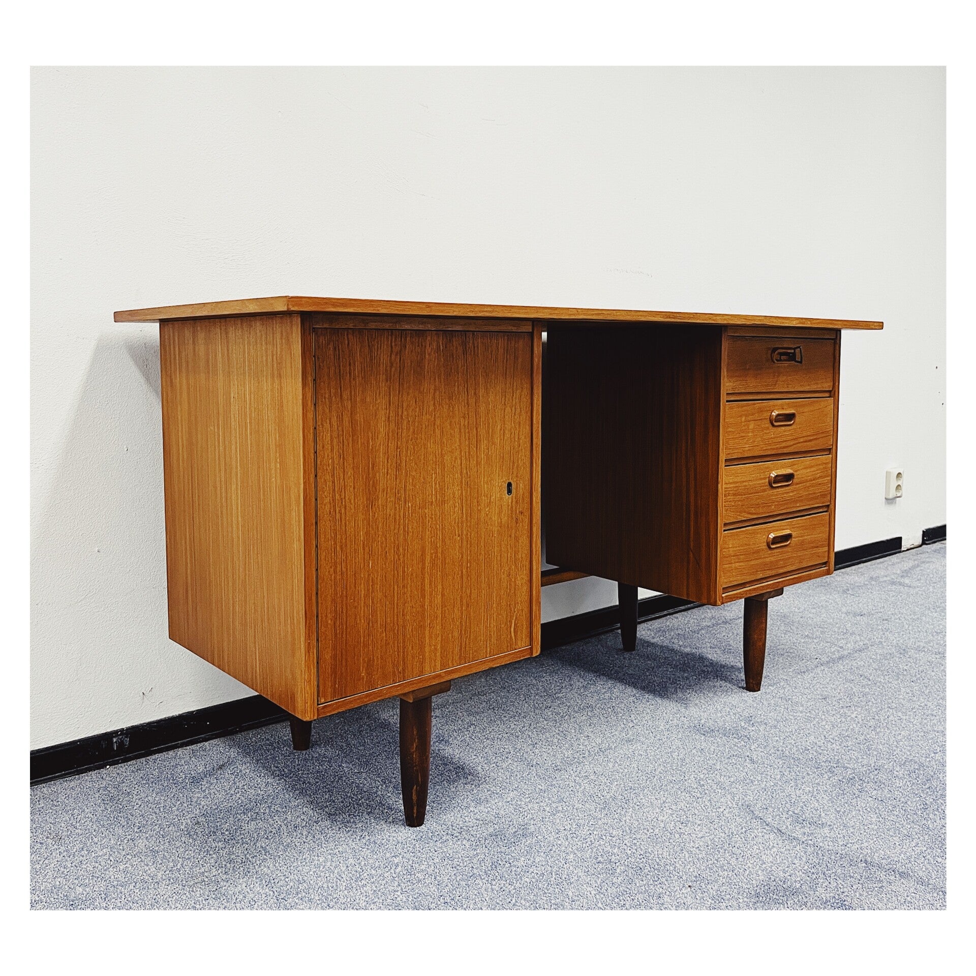 Dit prachtige vintage bureau is het ideale studeer- of werk meubel. Het bureau is vervaardigd in teak en teakfineer. Het meubel heeft aan de rechterzijde vier lades en aan de linkerzijde een kastje die kan worden afgesloten met metalen sleutel en slot. Het bureau heeft lichte ouderdomsvlekjes passend bij de leeftijd.
