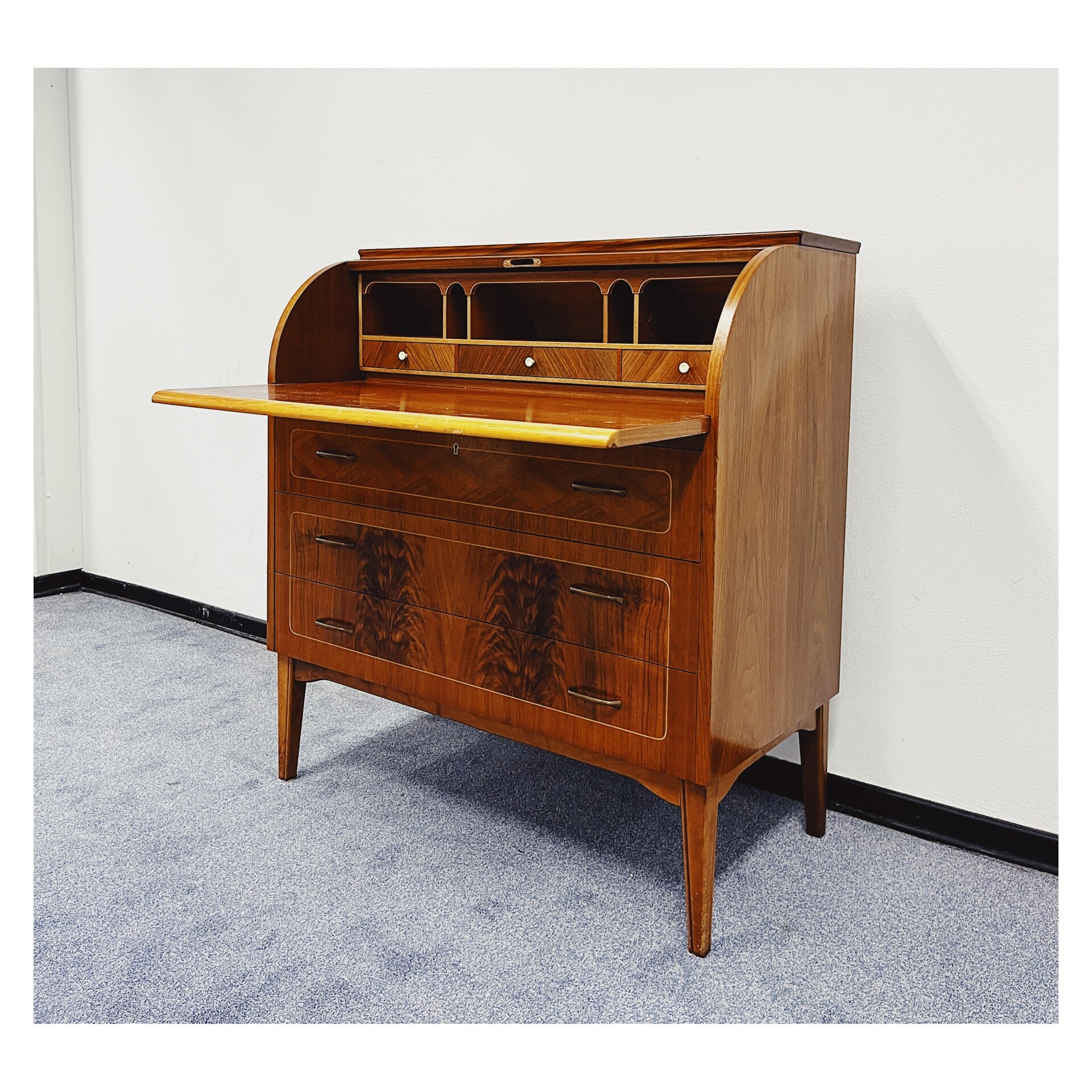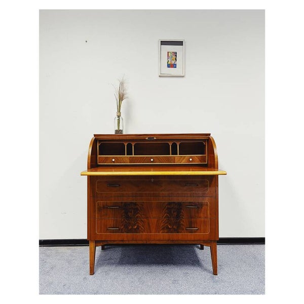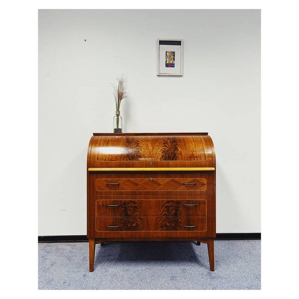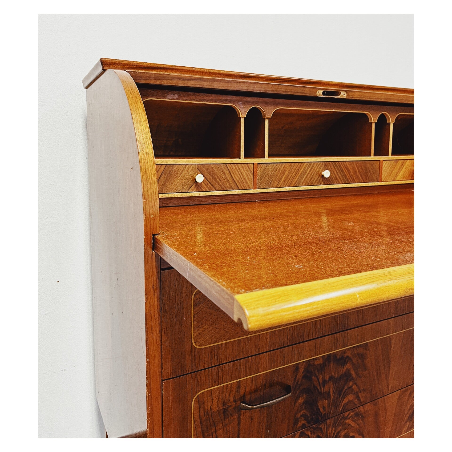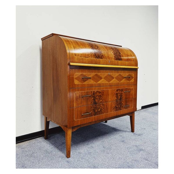 Mooie secretaire ontworpen door Egon Ostergaard. Het bijzondere bureau heeft een roltop sluiting en een uitschuifbaar tafelblad. Aan de bovenzijde van de kast bevinden zich enkele kleine laden voor het opbergen van spullen. Helaas ontbreken de sleutels, maar alles gaat gewoon open. Het bureau komt uit de jaren '60 en is een prachtig exemplaar voor in huis!
