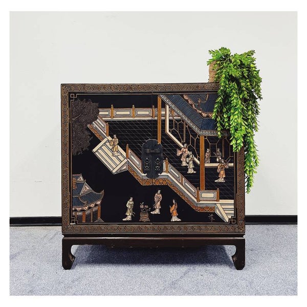 Bijzondere Chinese kast met schilderingen op de voor- en zijkanten. De kast heeft twee deuren en een grote ruimte voor het opbergen van spullen. De Chinese kast heeft wel flink wat beschadigingen in het lak opgelopen, dit is zo netjes als mogelijk bijgewerkt met een meubelstift!