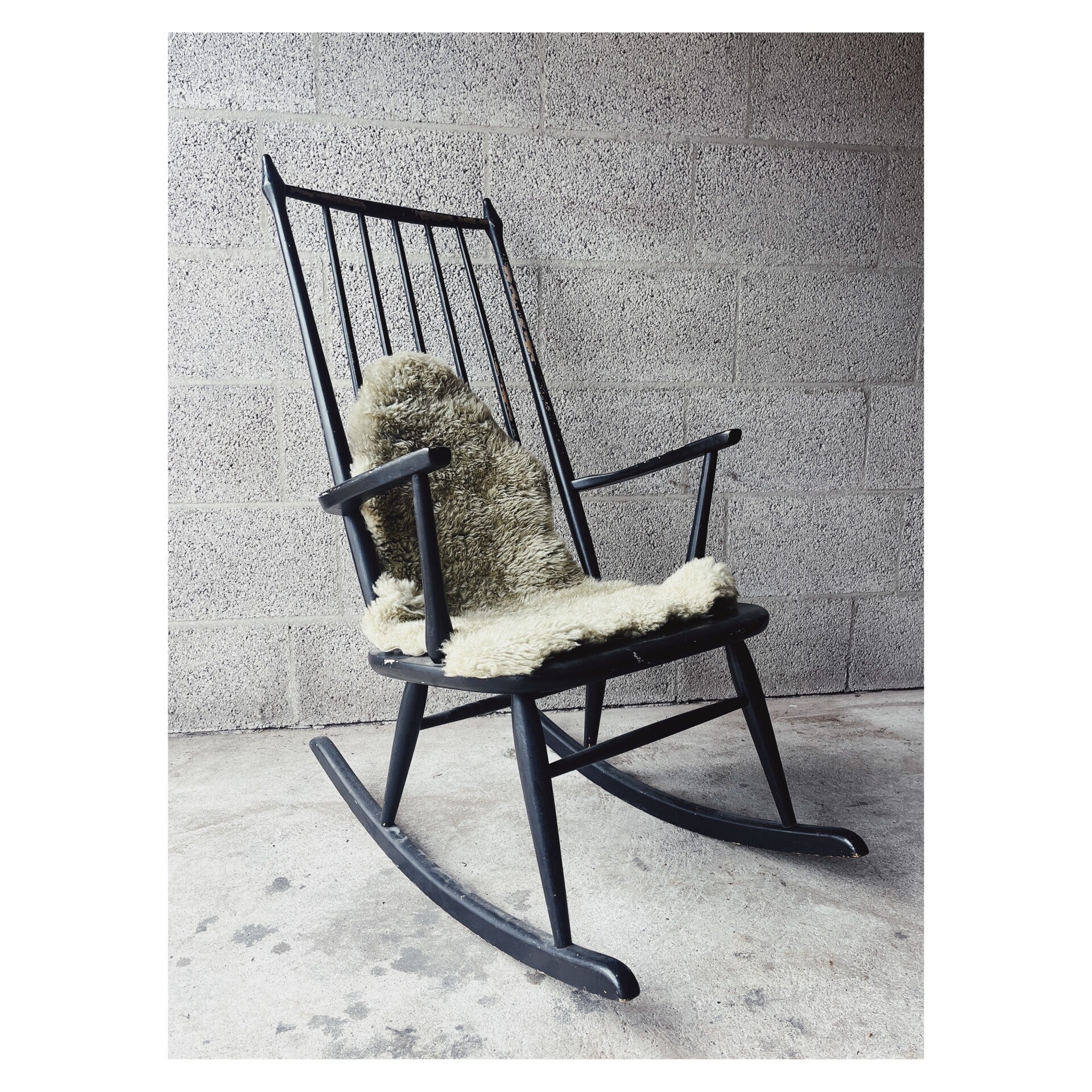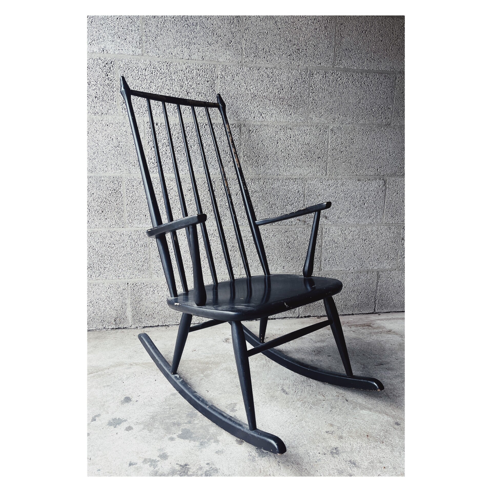 Zwarte gelakte schommelstoel. Ideaal voor een een gezellig zithoekje te creëren. AfmetingenHoogte: 115cmBreedte: 54cm