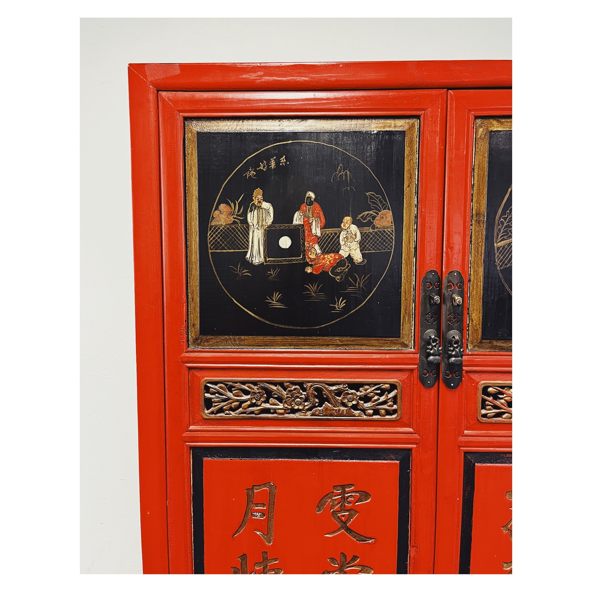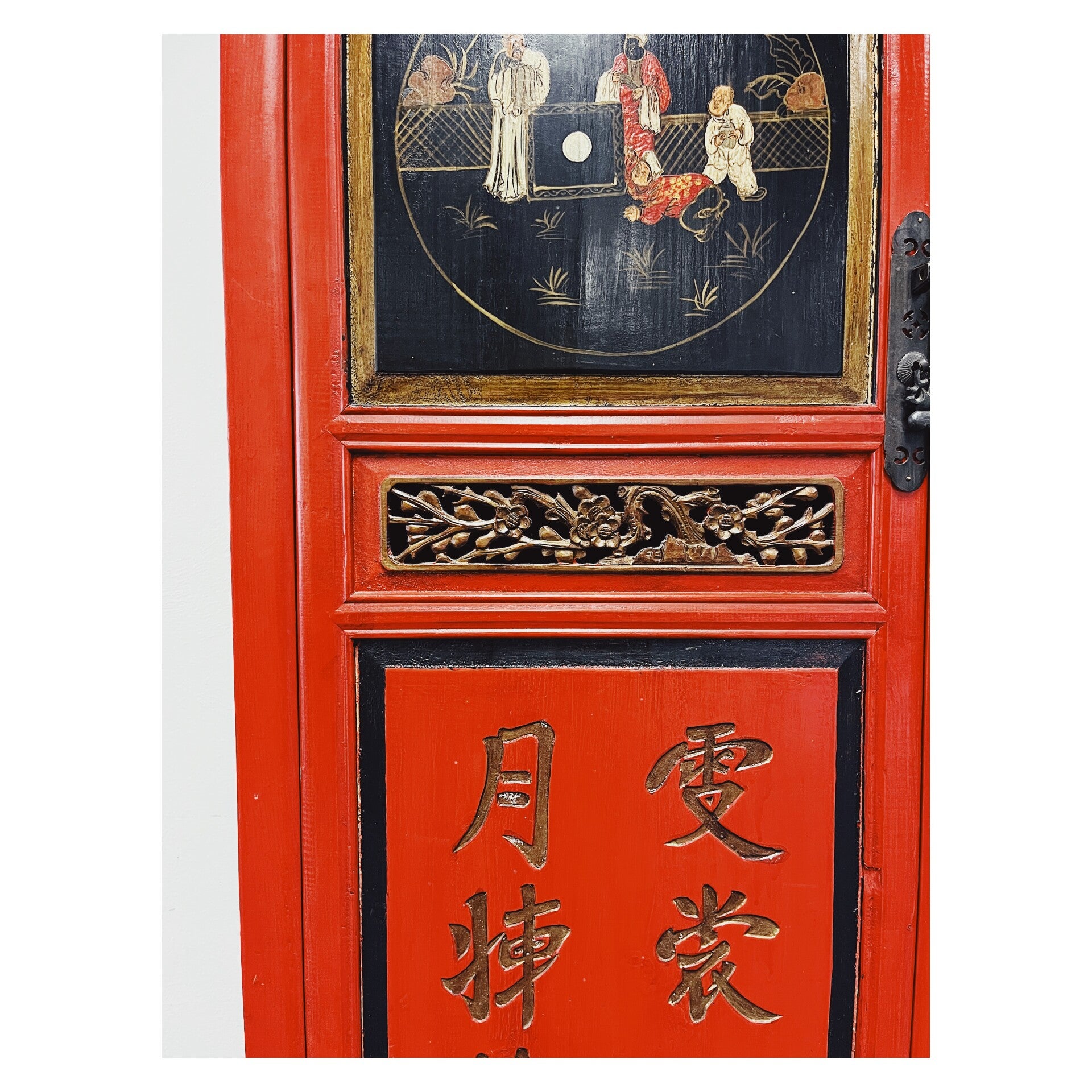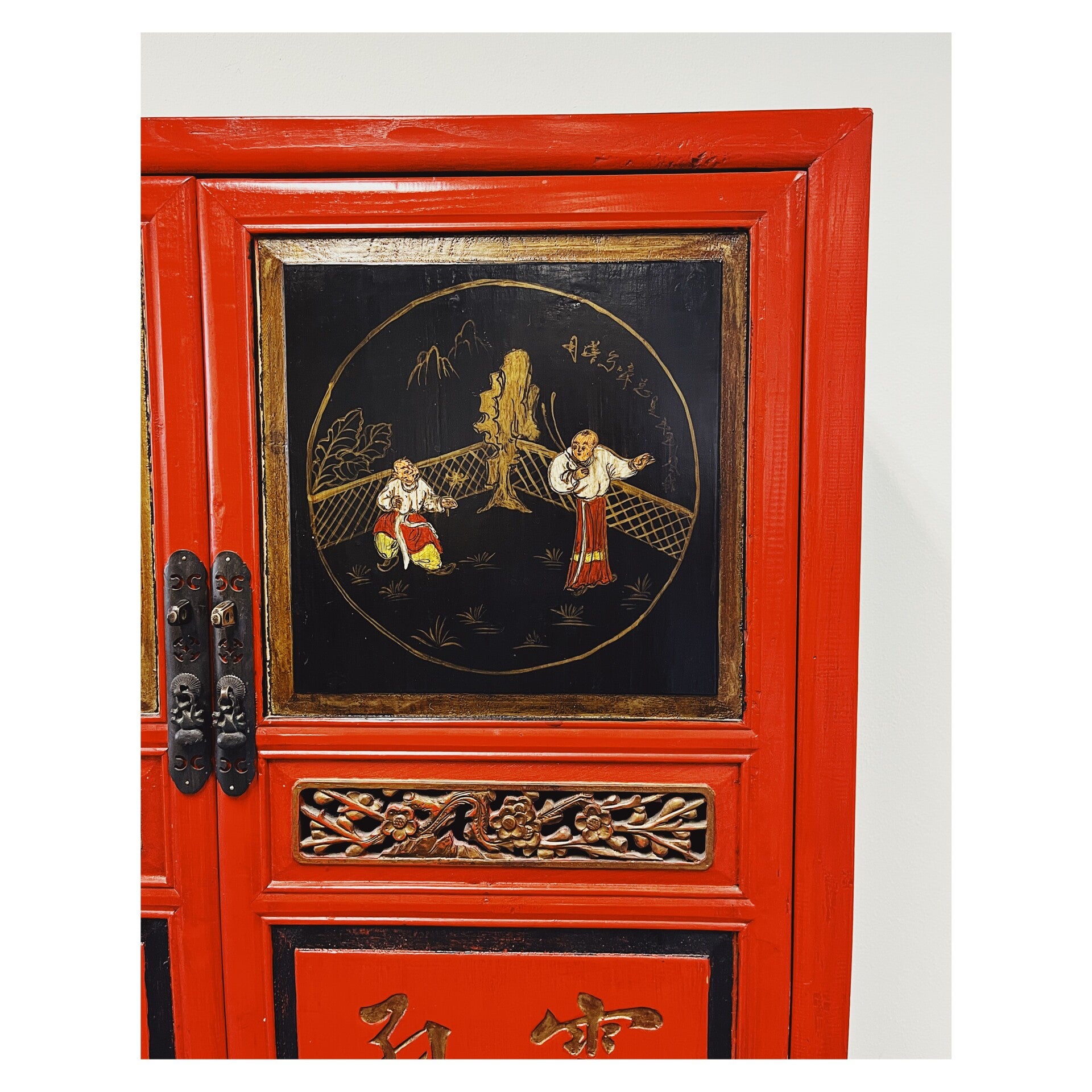 Waanzinnig mooie Chinese kast in de kleuren rood en zwart. De kast heeft op de voorgrond prachtige beschilderingen die variëren van mensen tot Chinese tekens. In het midden van de kast bevind zich ook een mooi stuk houtsnijwerk, wat de kast extra bijzonder maakt. De kast heeft wat standaard gebruikssporen naar leeftijd, maar kan zeker nog een volle ronde mee!