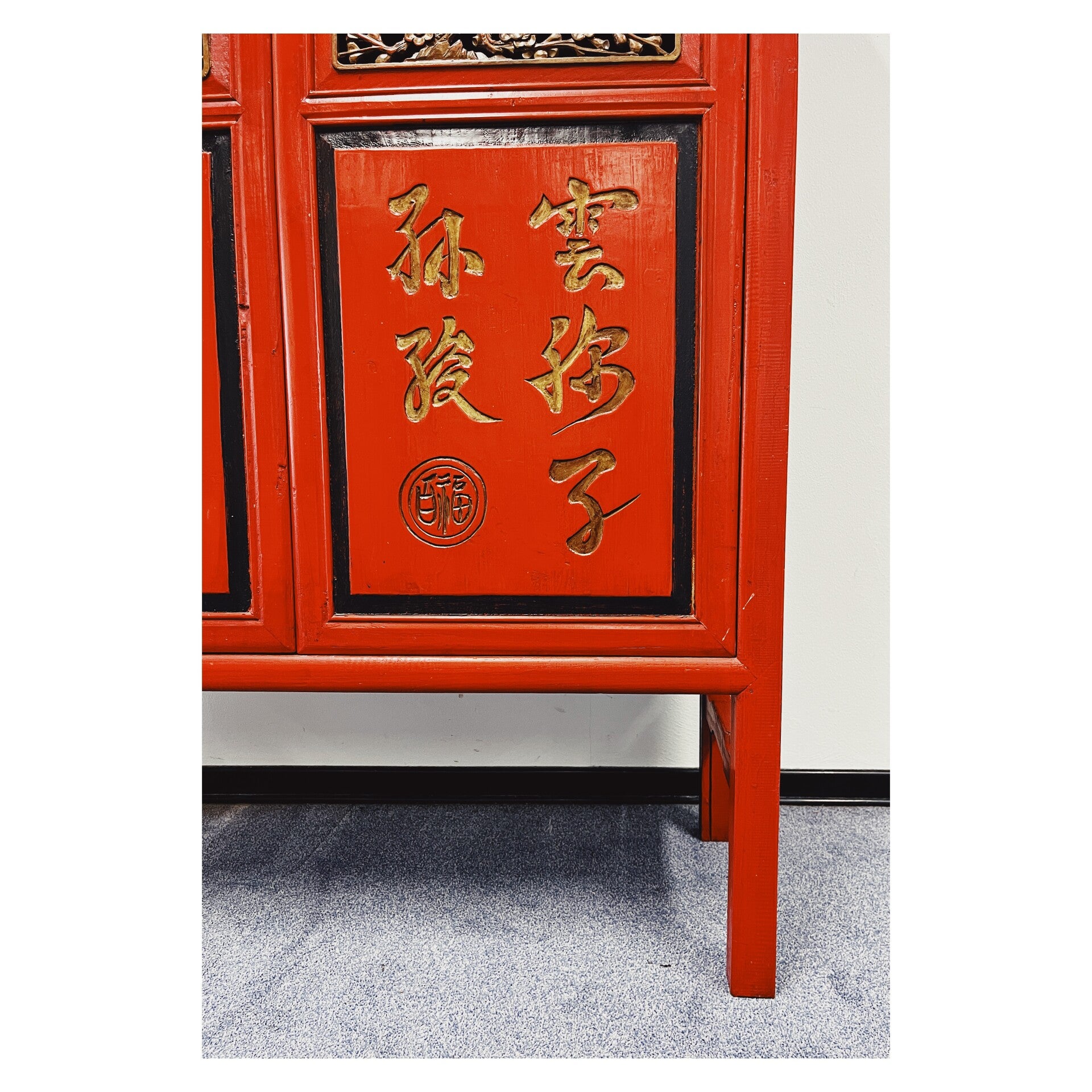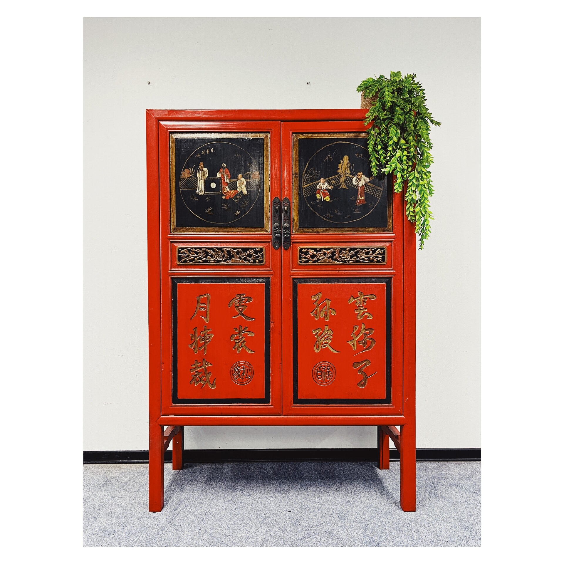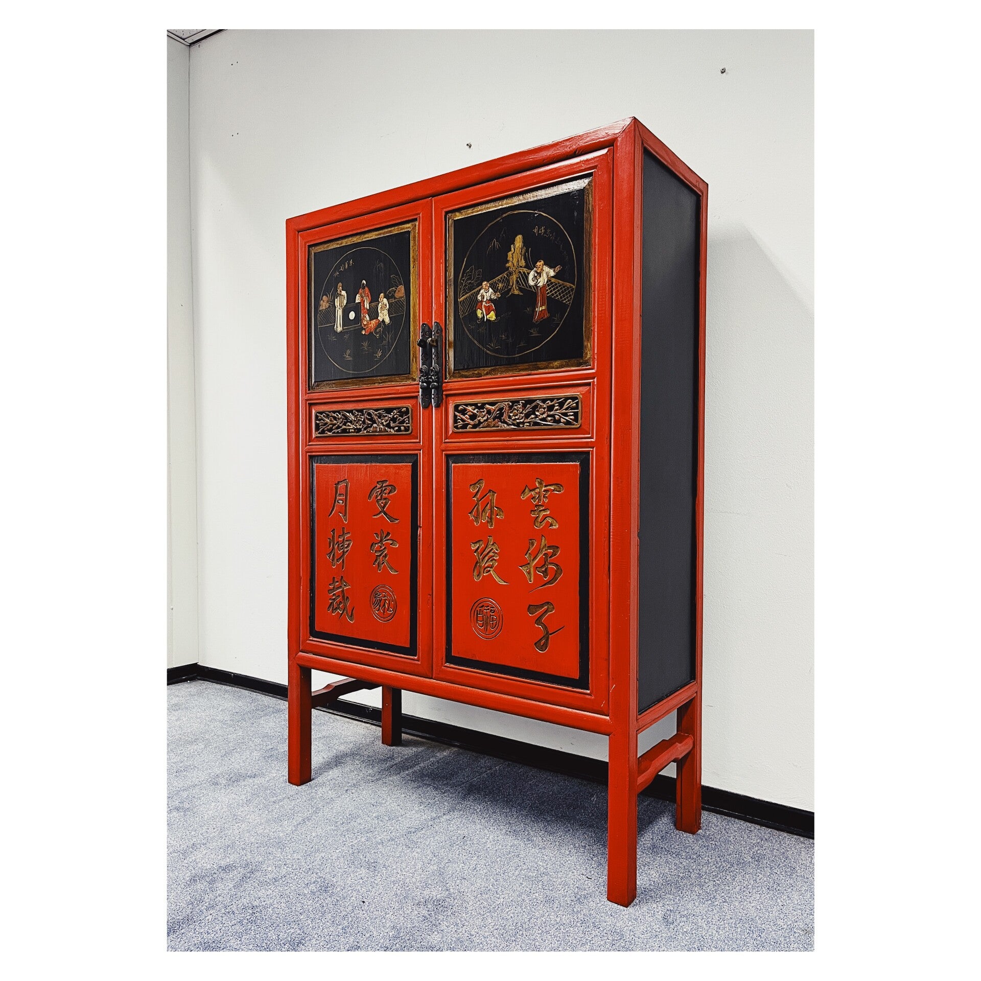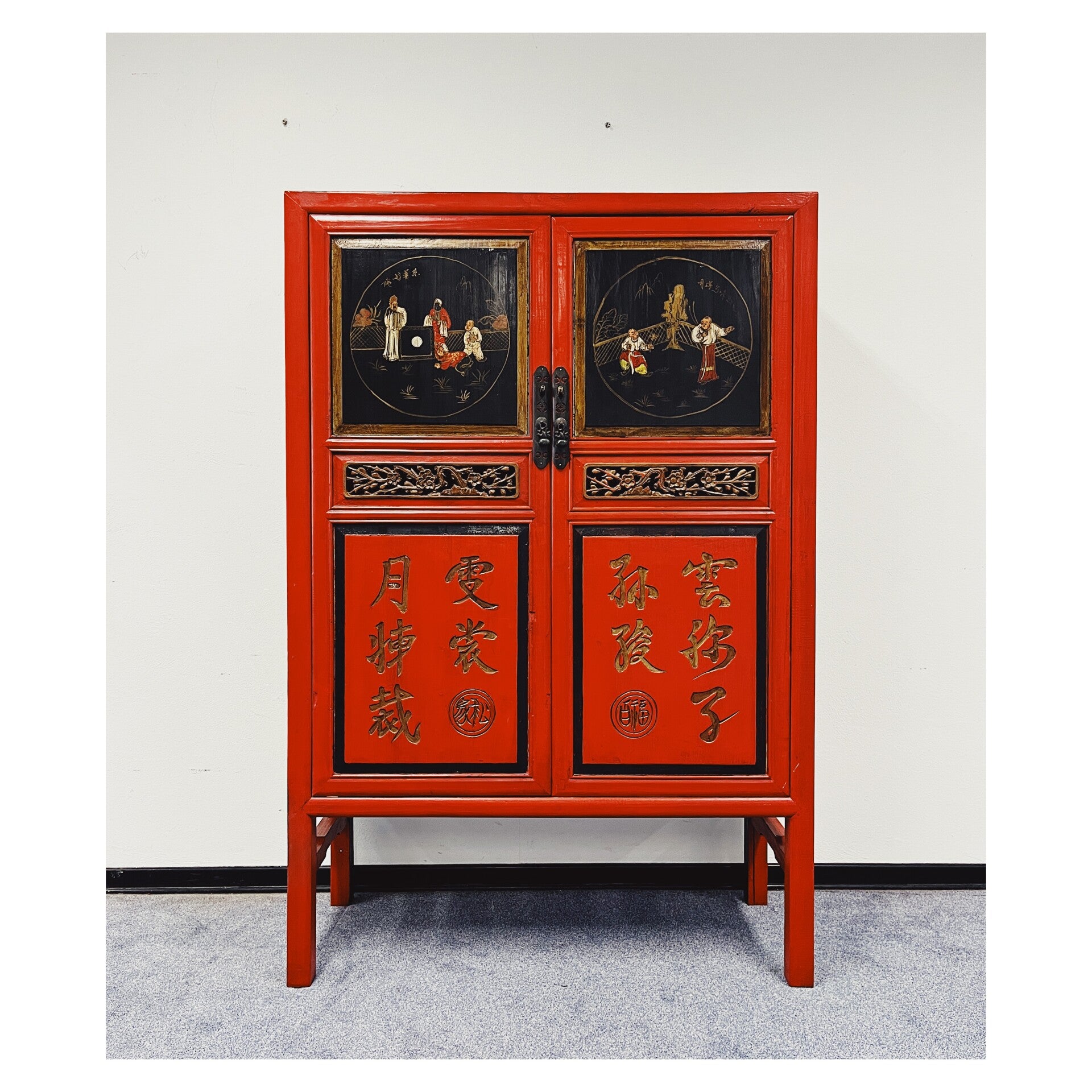 Waanzinnig mooie Chinese kast in de kleuren rood en zwart. De kast heeft op de voorgrond prachtige beschilderingen die variëren van mensen tot Chinese tekens. In het midden van de kast bevind zich ook een mooi stuk houtsnijwerk, wat de kast extra bijzonder maakt. De kast heeft wat standaard gebruikssporen naar leeftijd, maar kan zeker nog een volle ronde mee!