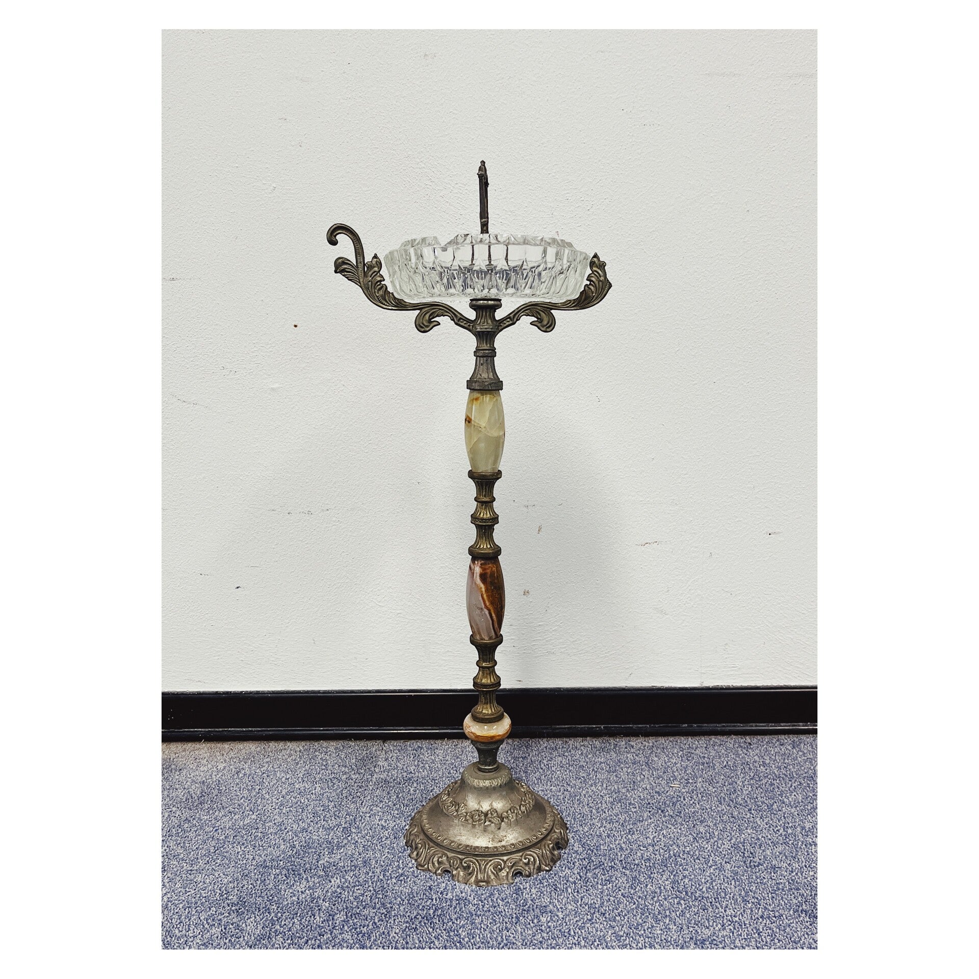 Antieke kristallen staande asbak op bronzen voet met marmeren details. De asbak heeft prachtige sierlijke messing details en is in goede vintage conditie!Afmetingen Hoogte: 65cm