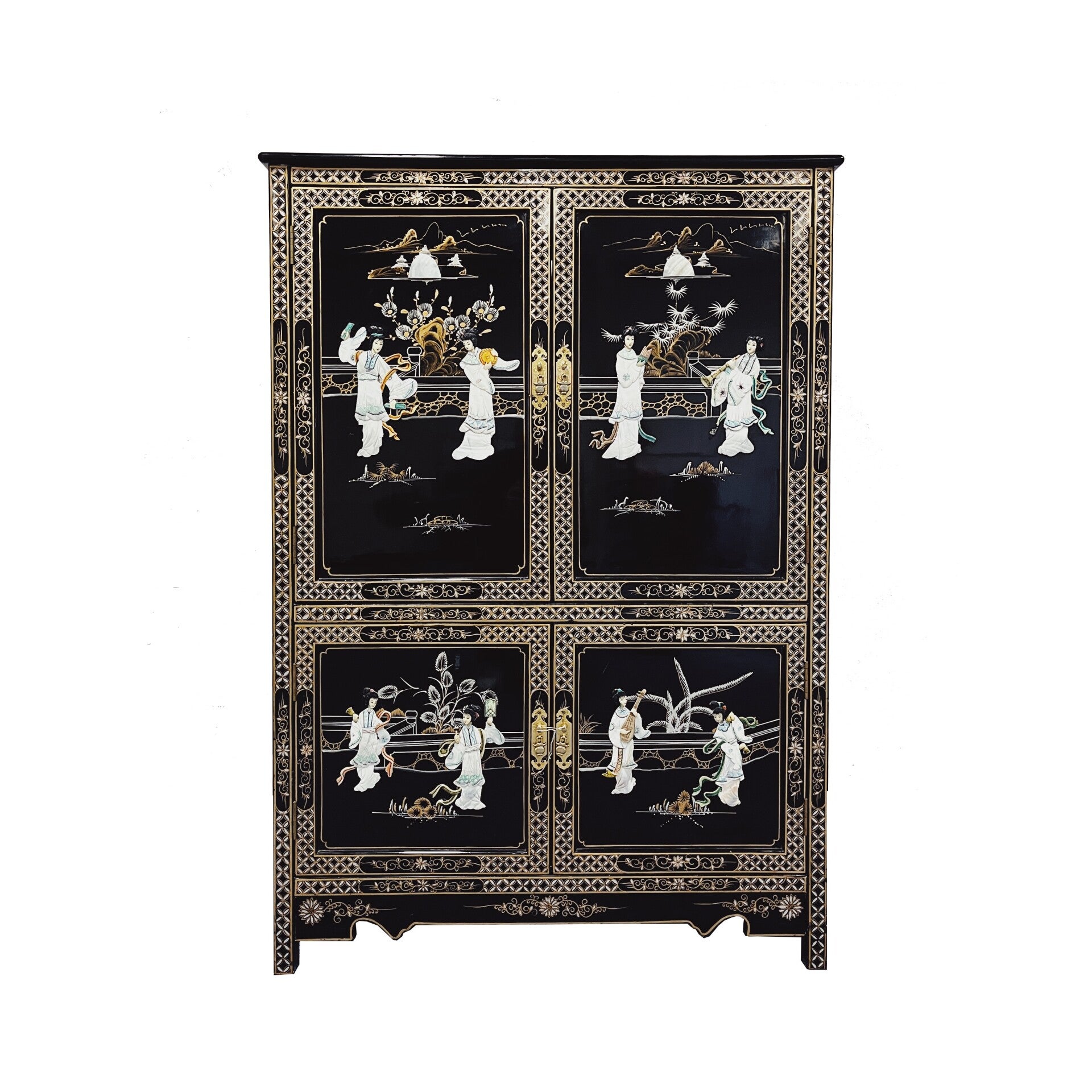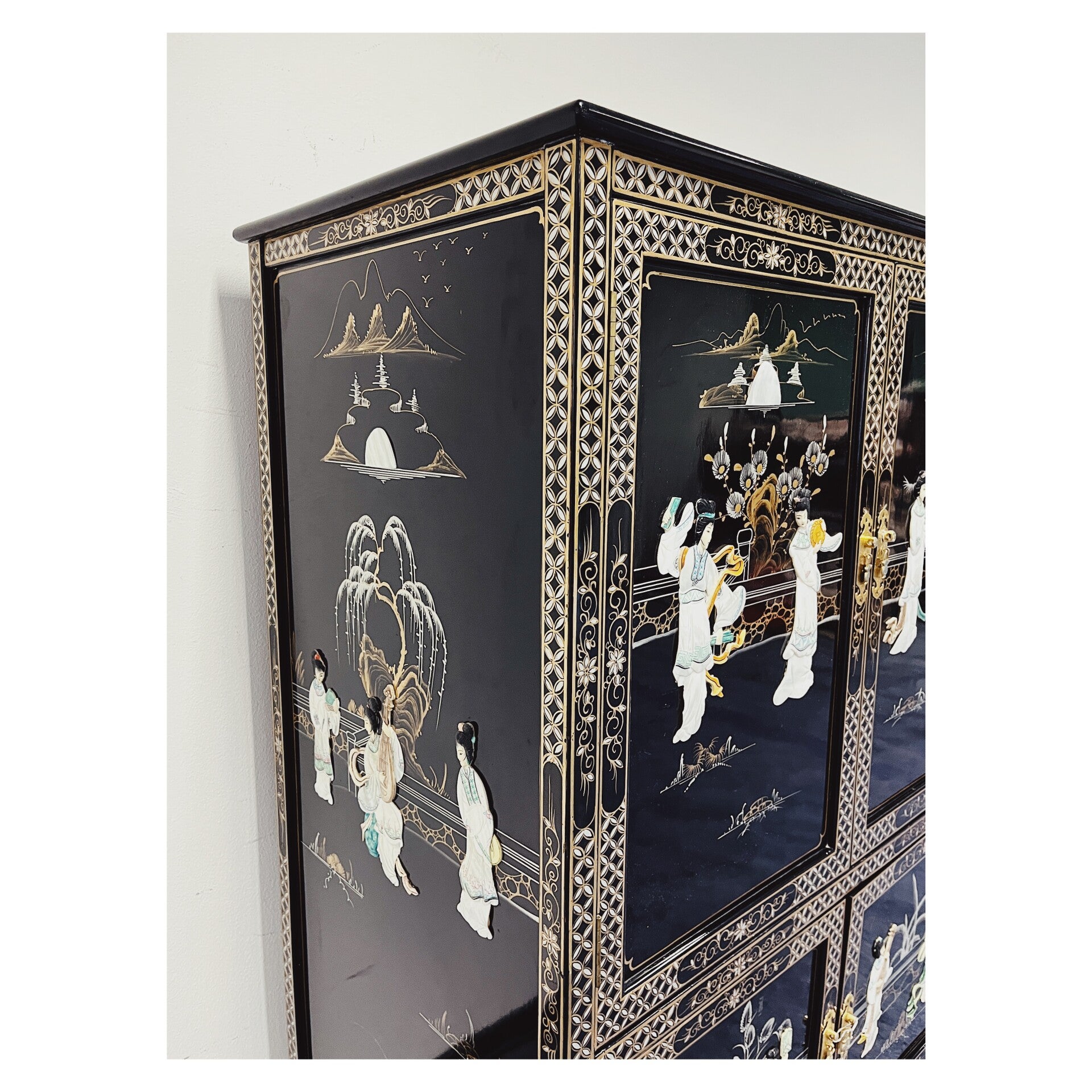 Wat een beauty is dit! Schitterende grote Chinese kast vermoedelijk rond 1980 gemaakt. De buitenkant van de kast heeft verschillende schilderingen en daarnaast ook versieringen ingelegd met speksteen! Naast de buitenkant heeft de kast ook versieringen aan de binnenkanten van de deuren!