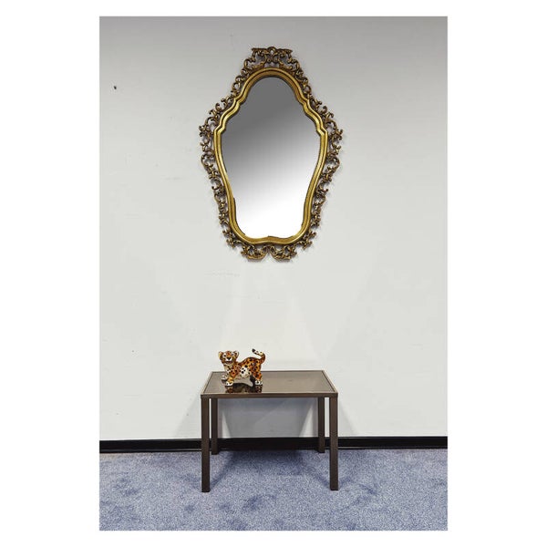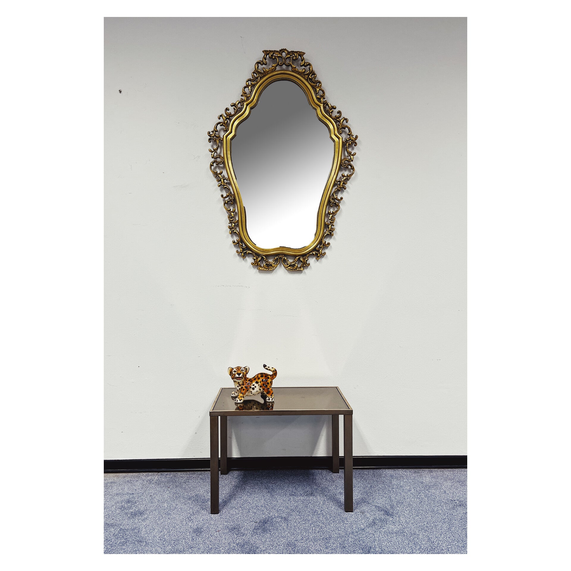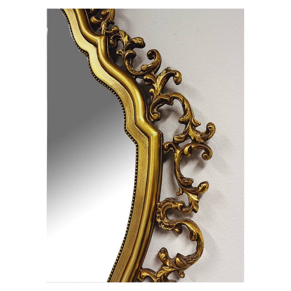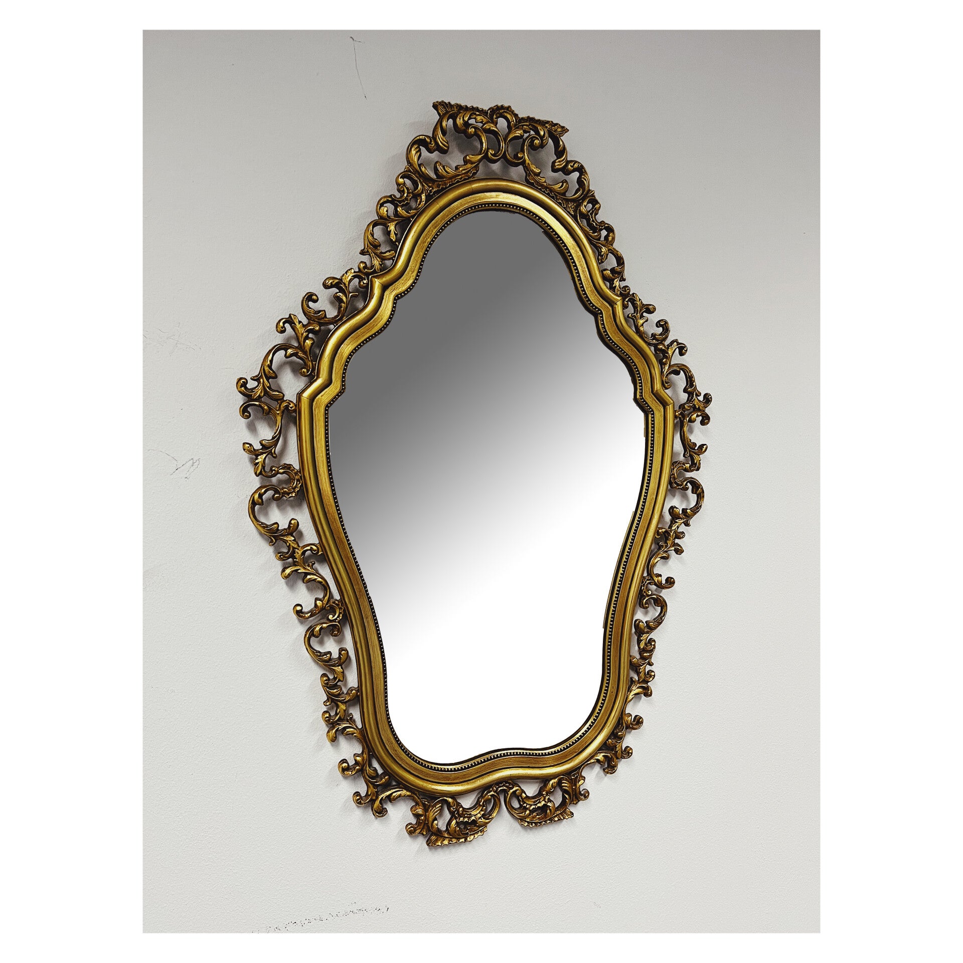 Klassieke barok spiegel met decoratief gouden frame. De spiegel heeft een prachtige houten lijst met een sierlijke krullen. Deze gouden klassieker is in hele goede conditie en heeft een stevig ophangsysteem.