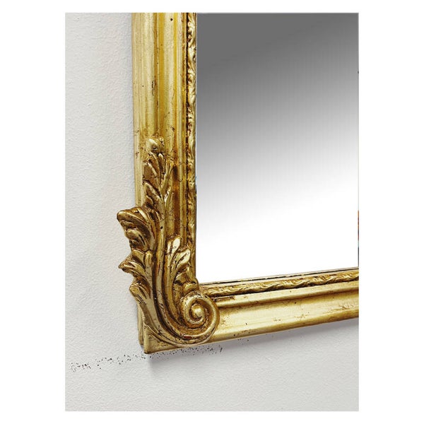 Klassieke barok spiegel met gouden frame. De rechthoekige spiegel heeft een prachtige gipsen lijst met een sierlijke kuif. De spiegel is in perfecte staat en heeft een stevig ophangsysteem.