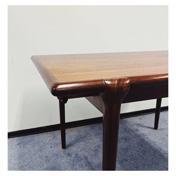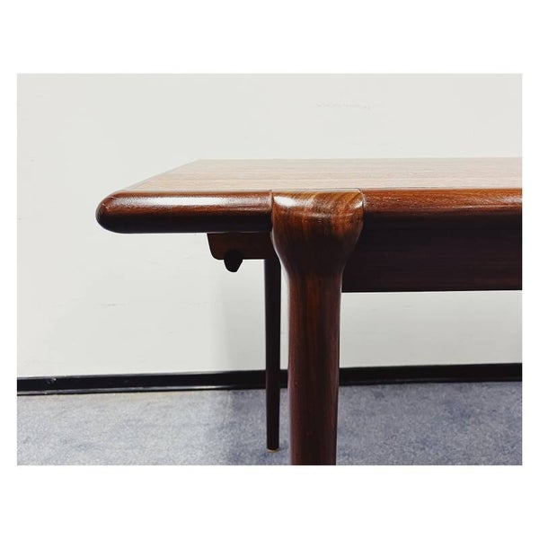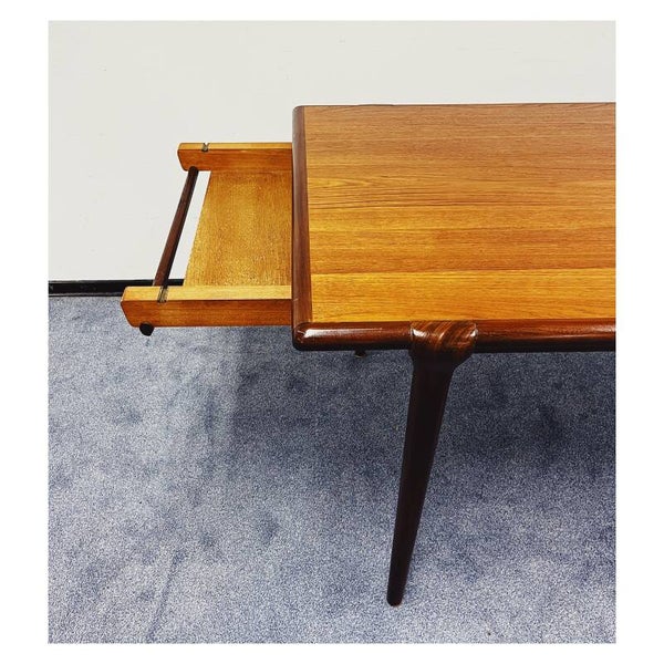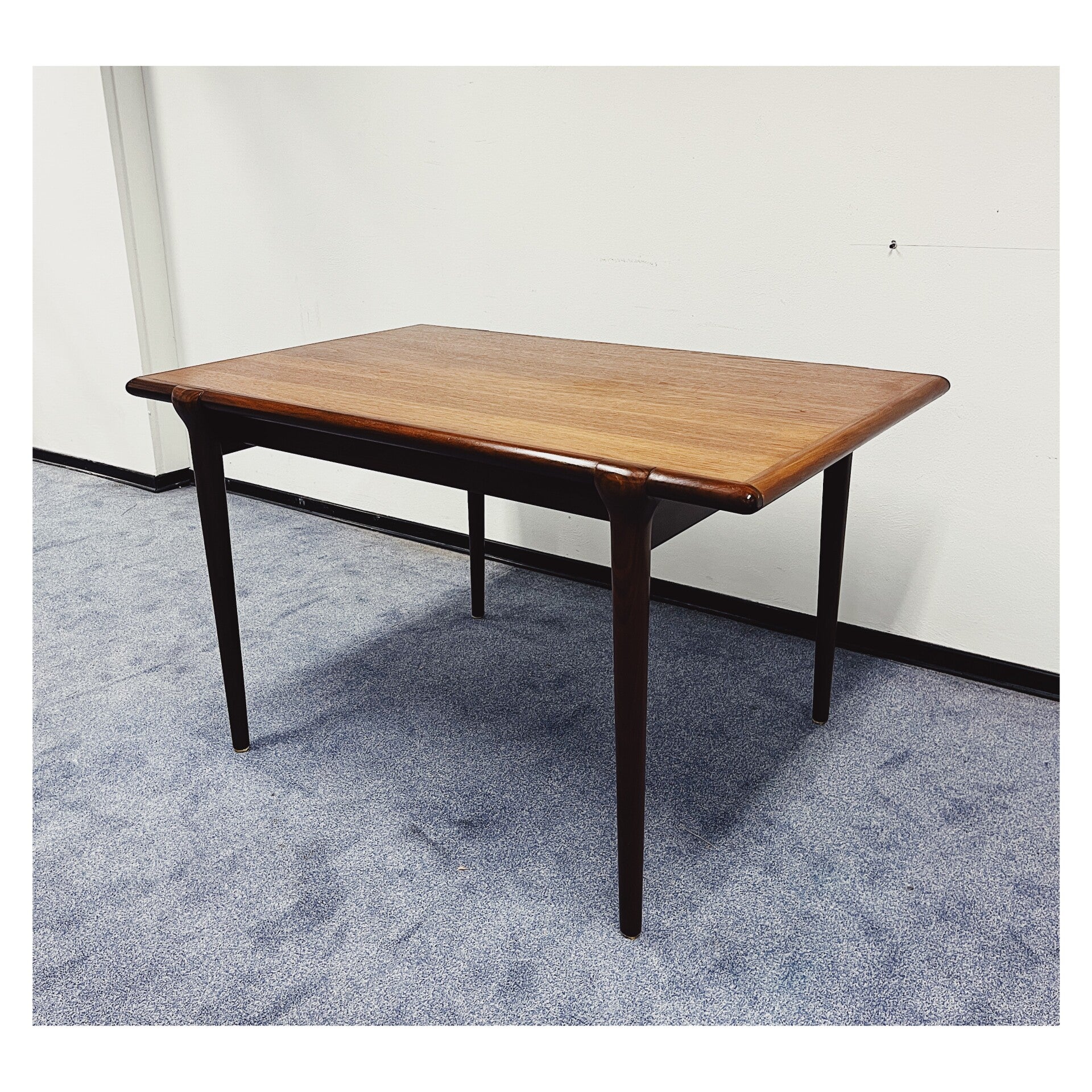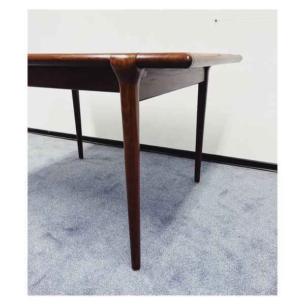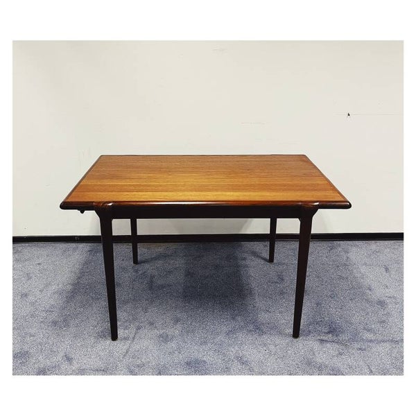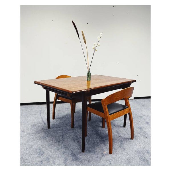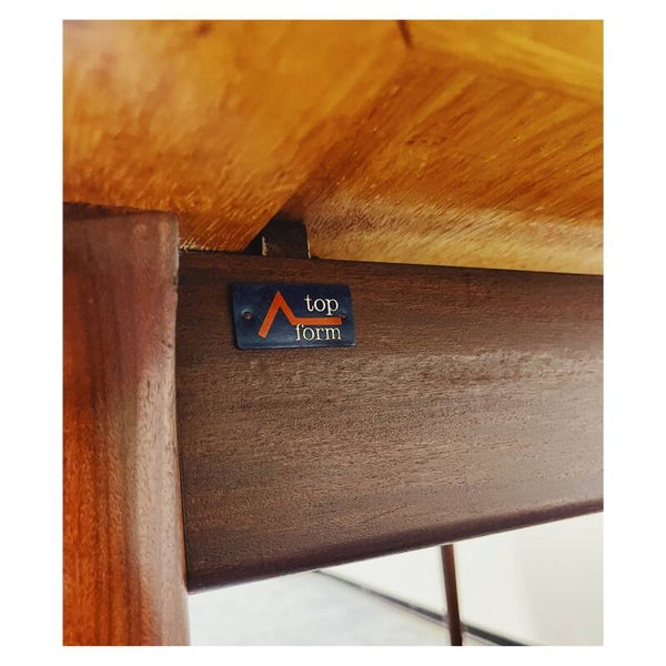 Mid Century eettafel van Topform. De tafel heeft een uitschuifbaar systeem maar hier mist helaas het tafelblad bij. Deze tafel is dus helaas niet te verlengen. Het onderstel van de tafel bestaat uit een mooi gevormd frame van massief hout. De tafel is in goede conditie met hier en daar wat krasjes naar leeftijd!