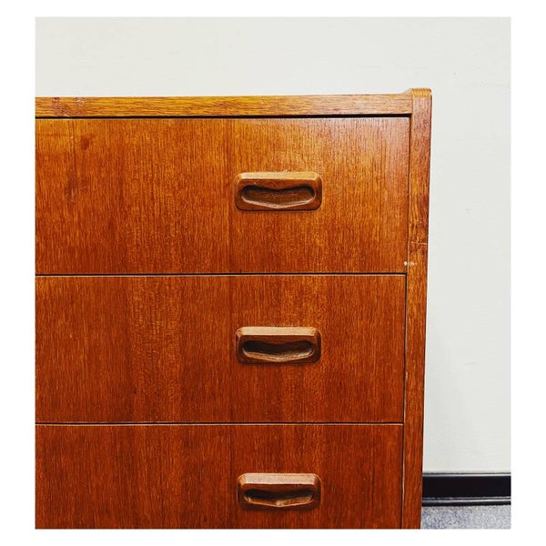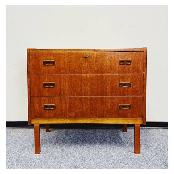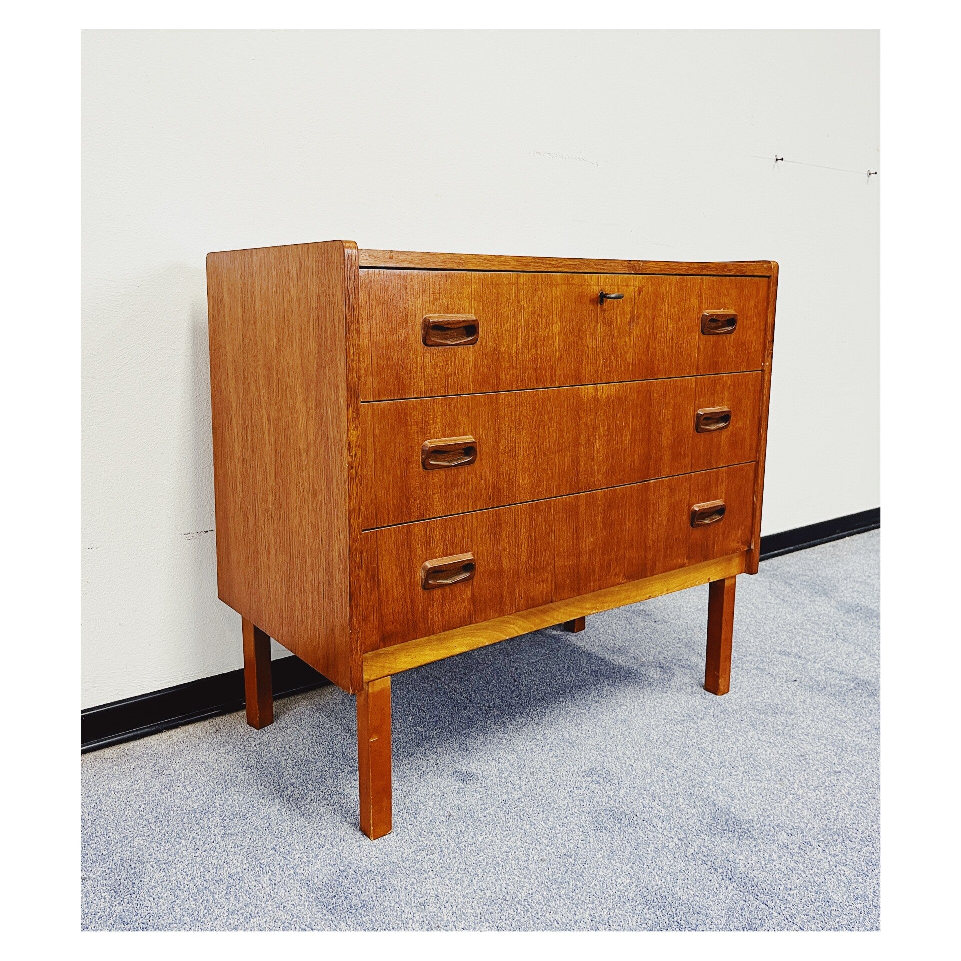 Vintage ladekastje uit Zweden. De teakhouten kast heeft drie ruime opbergladen met prachtige uit hout gesneden handgrepen en kunnen elk afzonderlijk worden afgesloten met een sleutel. De kast is uitgevoerd in prachtig teakfineer. De kast is in goede vintage conditie met wel wat zichtbare verkleuringen en vlekjes.