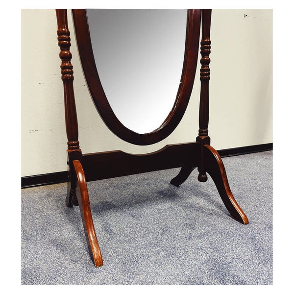 Vintage Passppiegel op voet. Het ovale frame van de spiegel is van mooi donker hout en is kantelbaar. De spiegel is in uitstekende conditie!