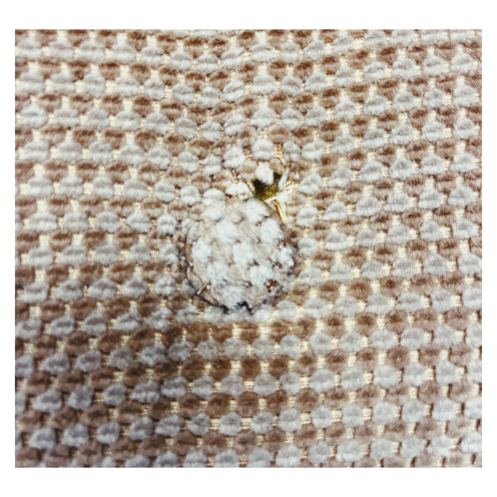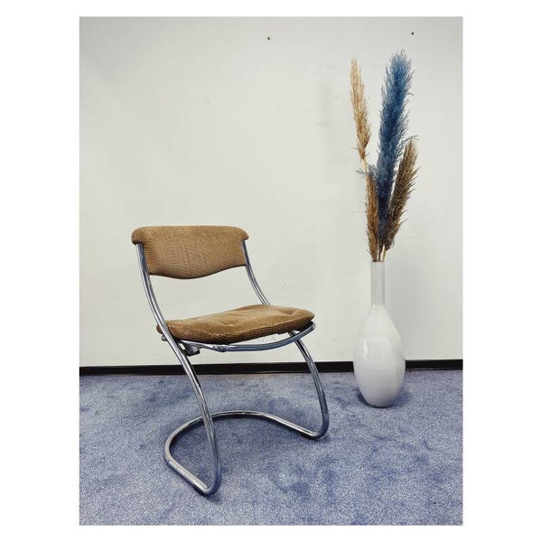 Een verchroomd metalen buisframe stoel met stoffen bekleding. De stoel heeft hier en daar wat standaard slijtage passend bij de leeftijd en een klein gaatje in het zitvlak, maar kan nog zeker een ronde mee!
