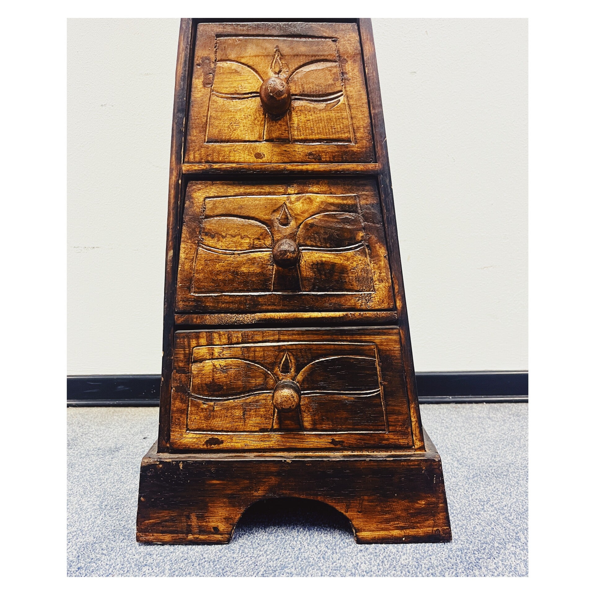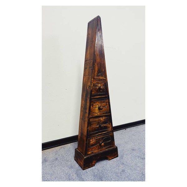 Vintage Zuidoost-Aziatische pyramide kast. De donkerbruine kast heeft vier laden en houtgesneden details. De kast is me de hand gemaakt en is in prima conditie!Afmetingen Hoogte: 99cmBreedte: 31cm