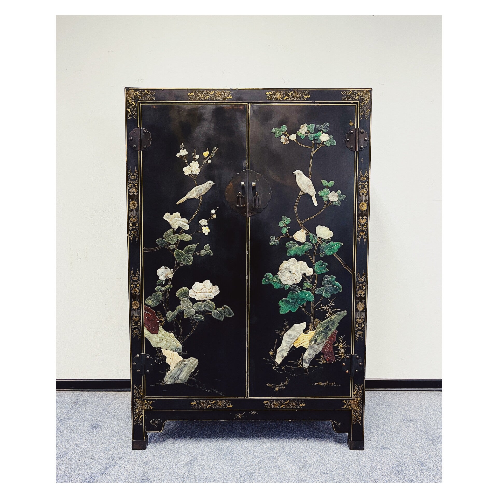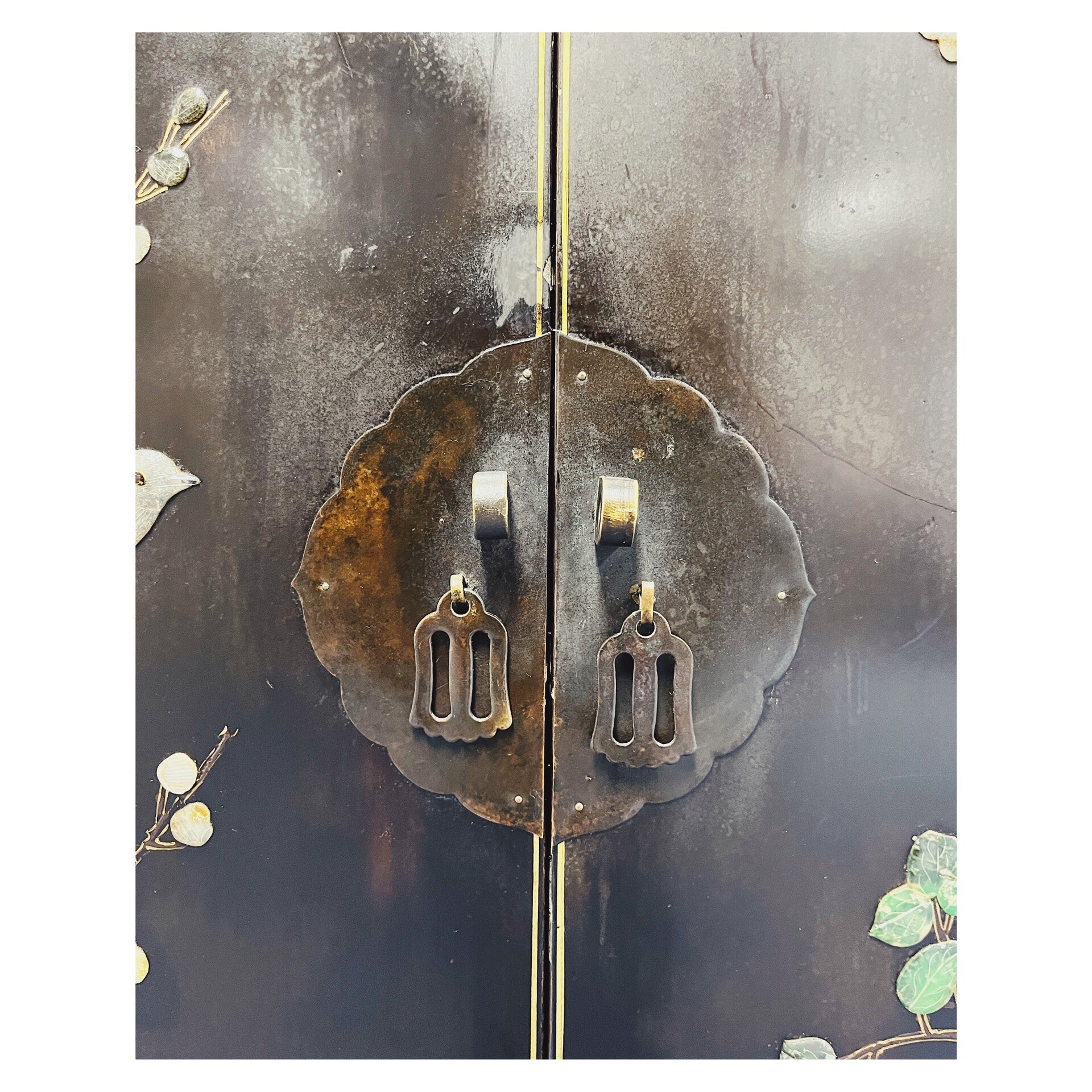 Leuke vintage Chinese kast met mooie versieringen aan de buitenkant. Sommige van de versieringen bestaan uit speksteen, wat af en toe wordt gebruikt voor het decoreren van Chinese kasten. De kast heeft twee deuren en drie ruime schappen aan de binnenkant. Daarnaast heeft de kast ook nog twee kleine laden. De kast heeft hier en daar wat kleine slijtageplekken, maar niks ernstigs!