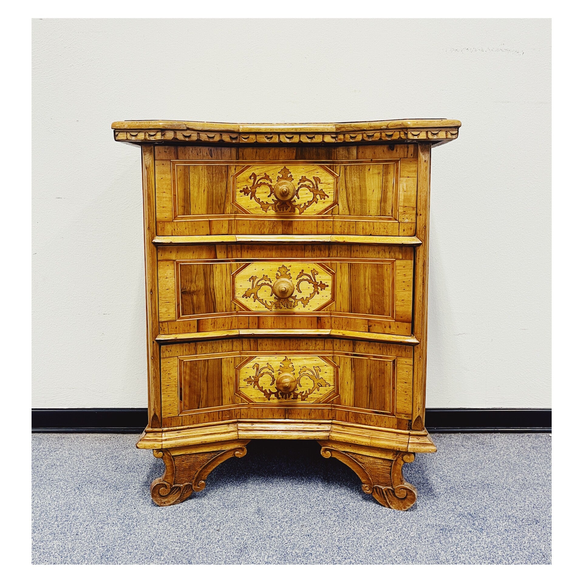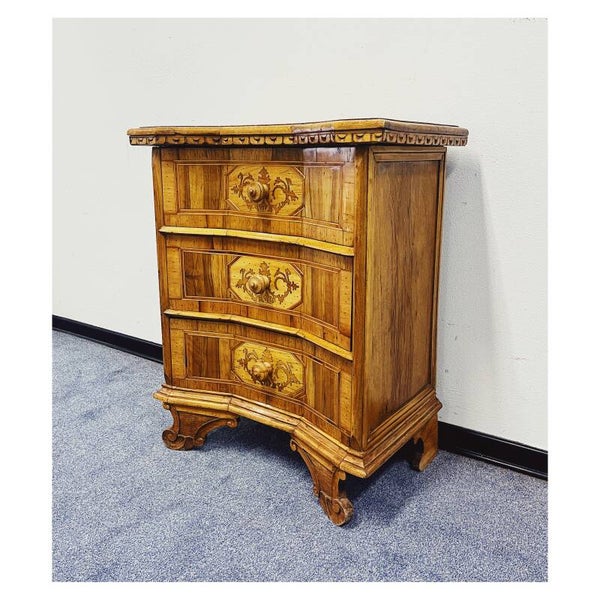 Elegant Italiaans ladekastje in barokstijl. Het kastje bezit prachtig inlegwerk en sierlijke poten. Het kastje heeft drie ruime opbergladen. Naast enkele kleine gebruikssporen en een houtscheur op het bovenblad is het Italiaans nachtkastje in goede staat!