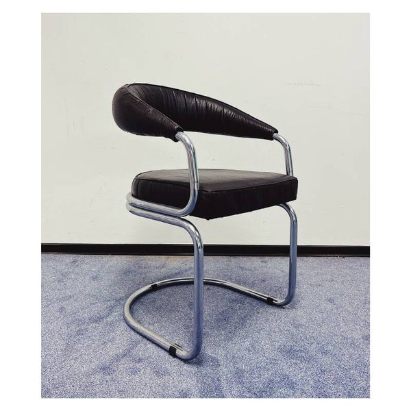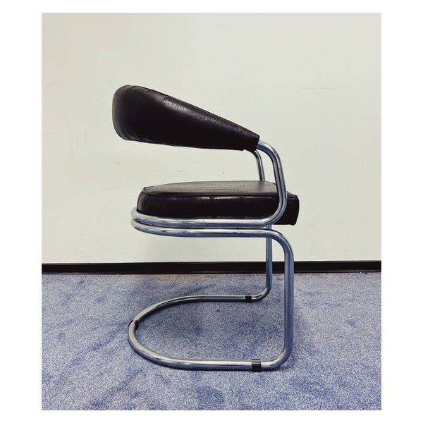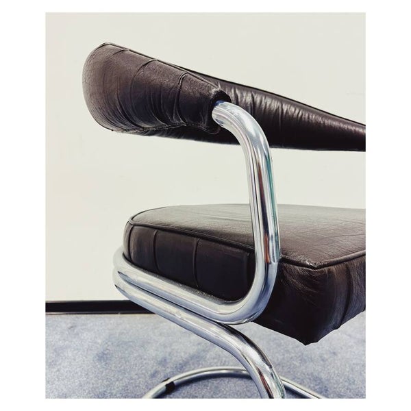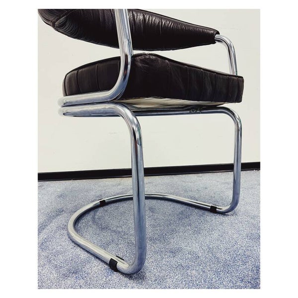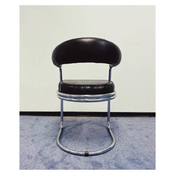Vintage eetkamer stoel ontworpen in de stijl van Giotto Stoppino. De stoel bestaat uit een buisframe van zilver chroom, en een zit- en rugvlak gemaakt van leer. Het chroom heeft hier en daar wat roest en het leer een mooie patina. De stoelen kunnen zeker nog een ronde mee! De prijs van de stoel is per stuk (1 beschikbaar).