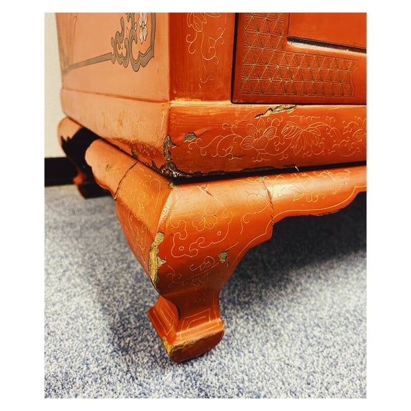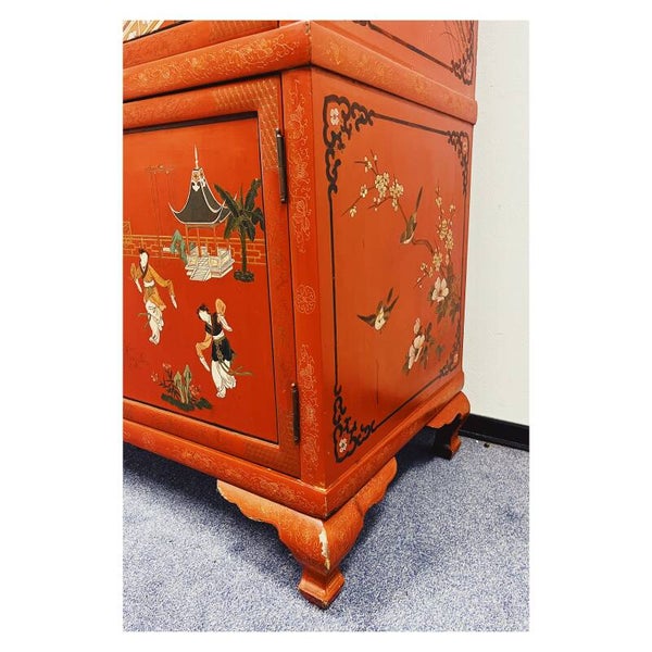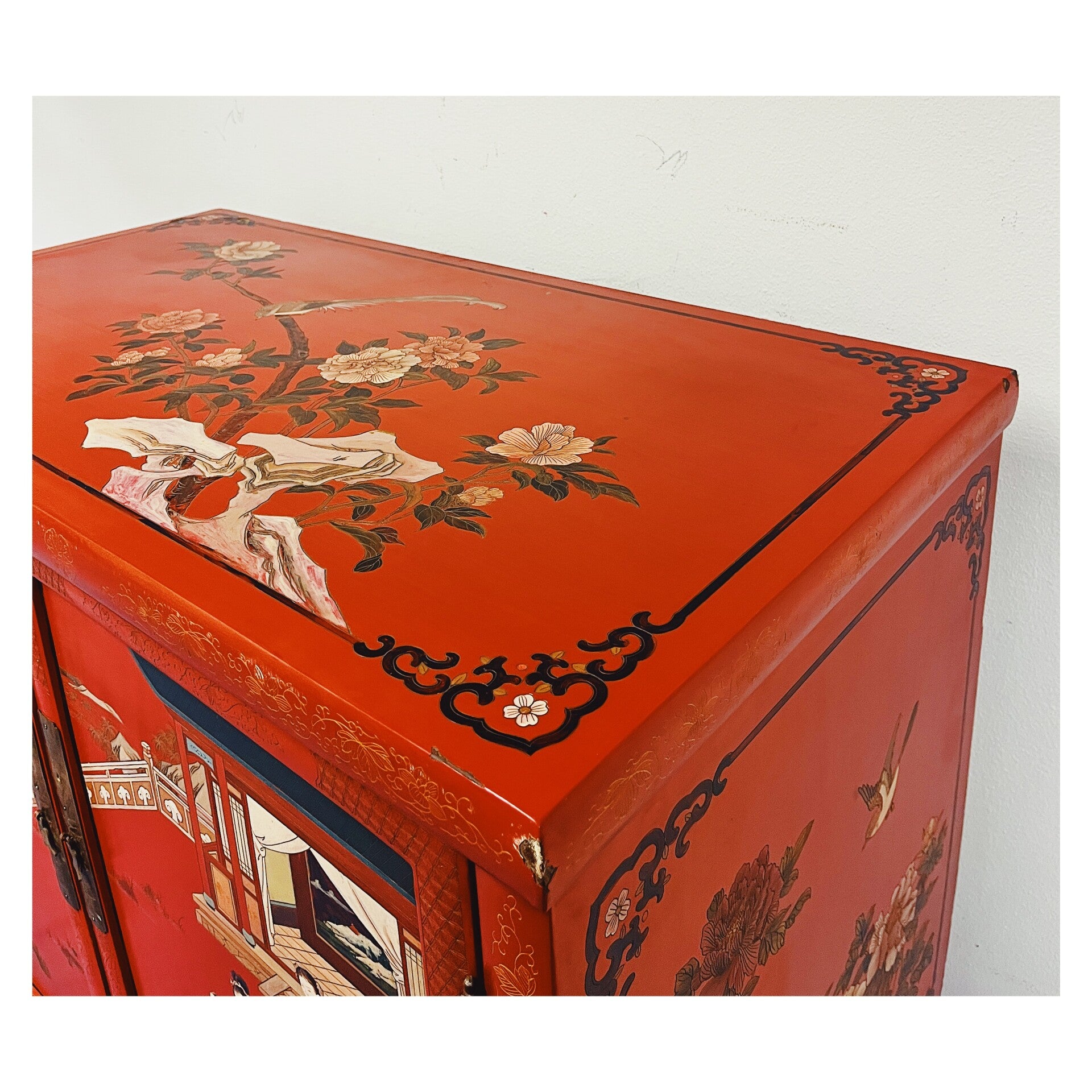 Bijzondere Chinese kast in de kleur rood. De kast heeft op de voorgrond prachtige beschilderingen die variëren van mensen tot Chinese tekens. Deze beschilderingen zijn in 3D effect. De Chinese kast heeft wel wat beschadigingen in het lak opgelopen, dit is echter totaal niet storend, en de kast kan zeker nog een ronde mee!