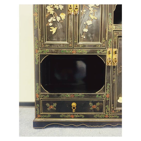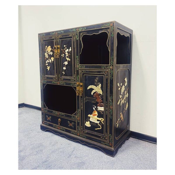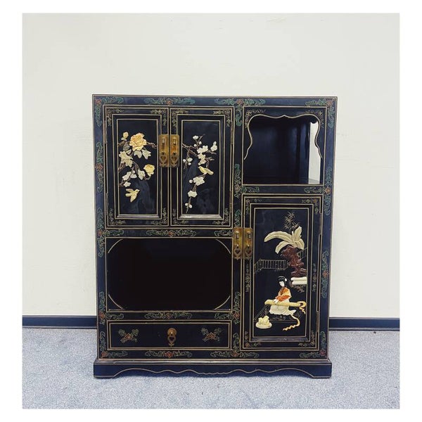 Bijzondere Chinese kast met veel verschillende opbergmogelijkheden. De kast heeft drie open stukken voor het tentoonstellen van andere items. Daarnaast heeft de Chinese kast nog drie deurtjes en één lade. De buitenkanten van de kast zijn versierd met speksteen in verschillende kleuren. De kast verkeerd in een algemene goede staat. Wel heeft het zwarte lak hier en daar wat vlekken. Dit is mogelijk nog op te lossen met een zwarte lakspray.
