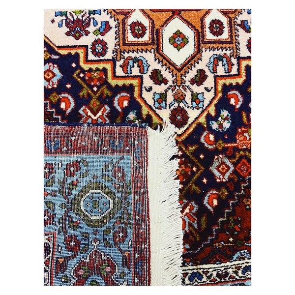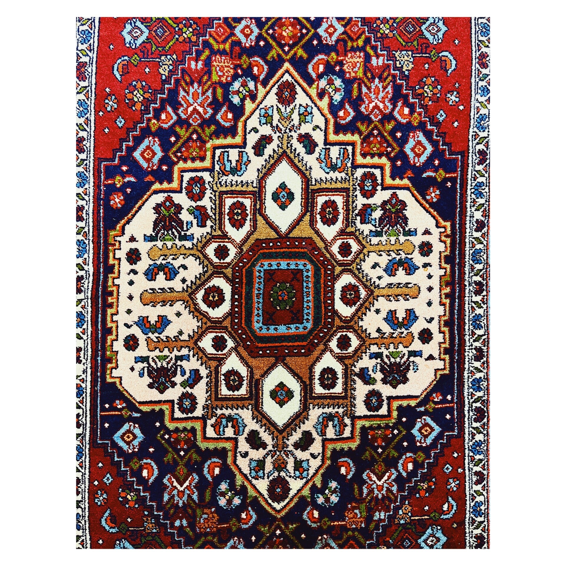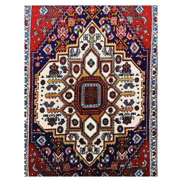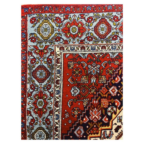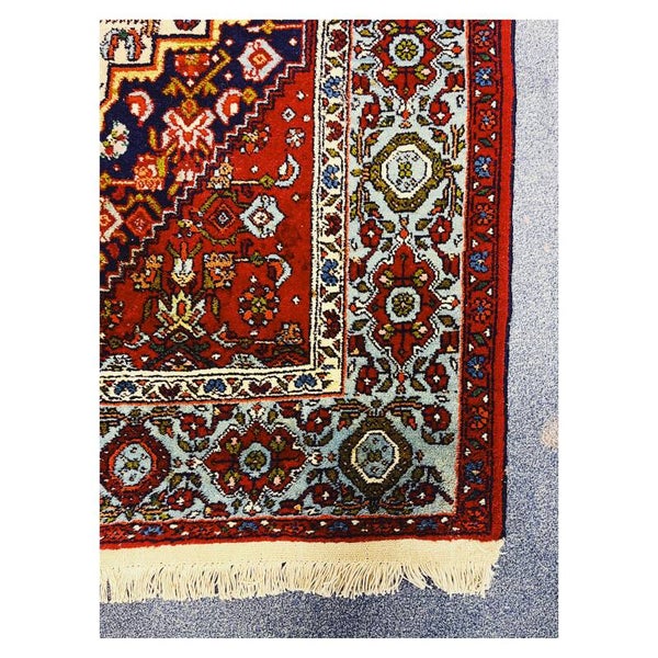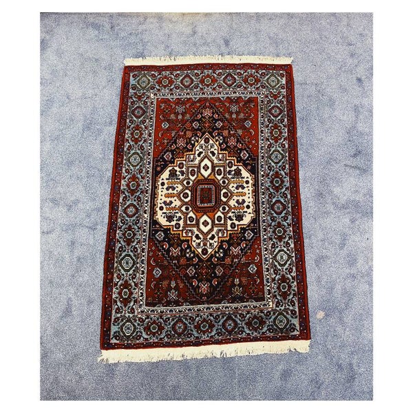 Bijzonder handgeknoopt kleed afkomstig uit Iran. Het tapijt heeft als basiskleur rood, en daarnaast nog crème en blauwe kleurige details. Het kleed verkeerd in een goede staat!